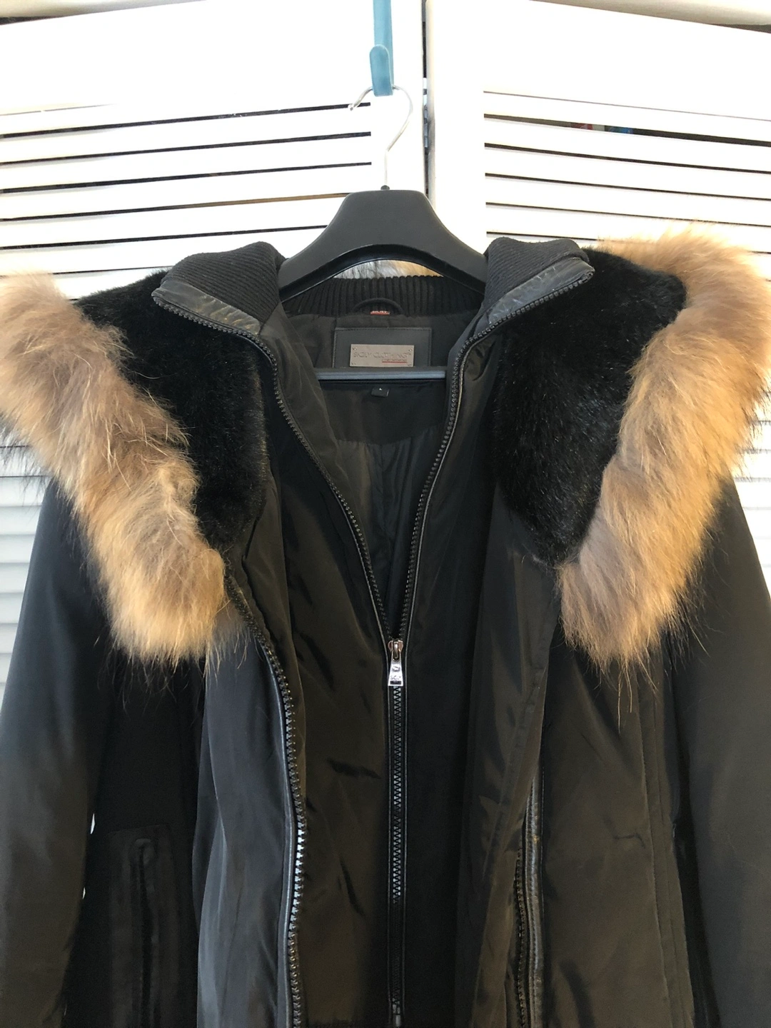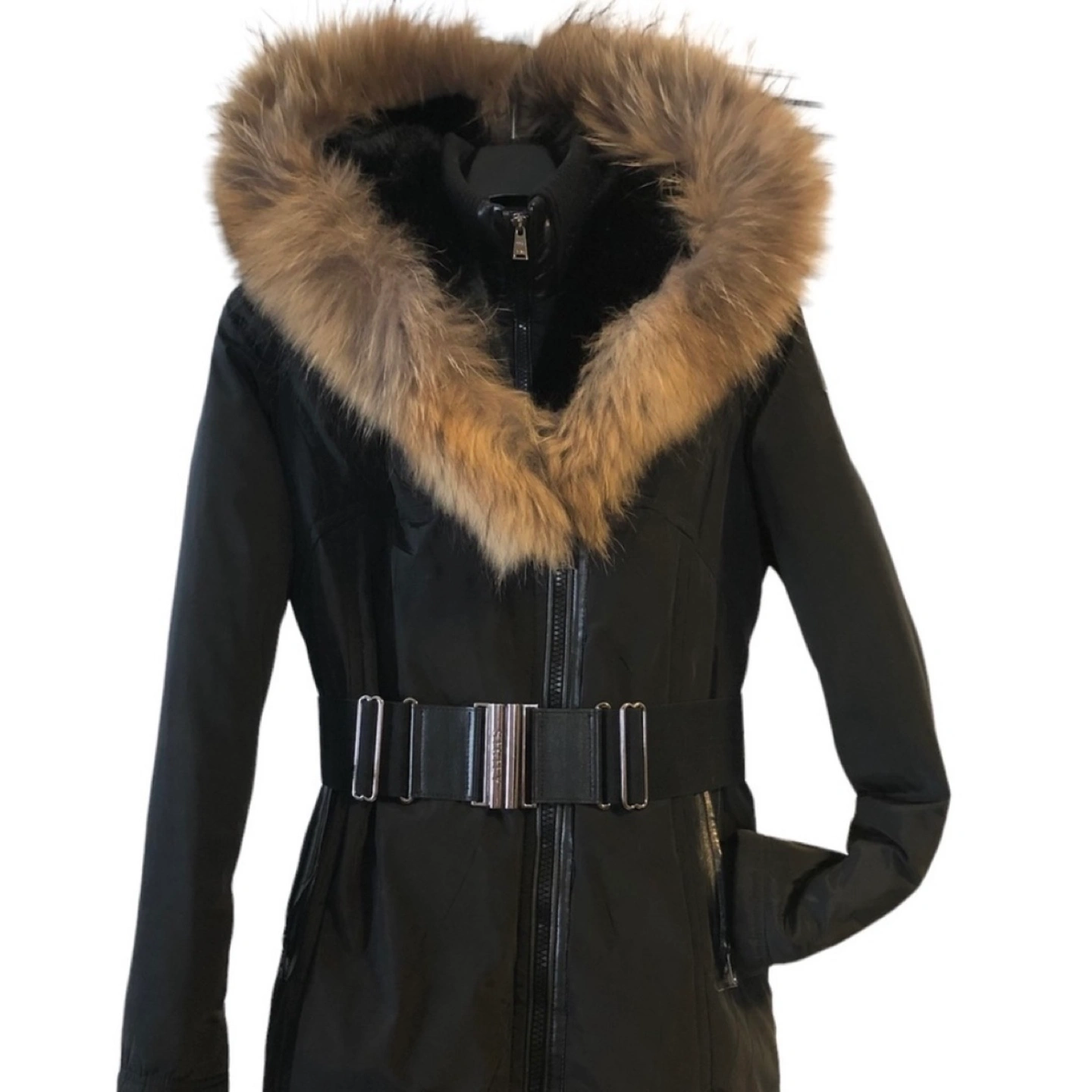 Size large, but fits like a medium, can be worn with or without belt. Minor wear on hand warmers otherwise in excellent condition. Very warm and eye turning coat.