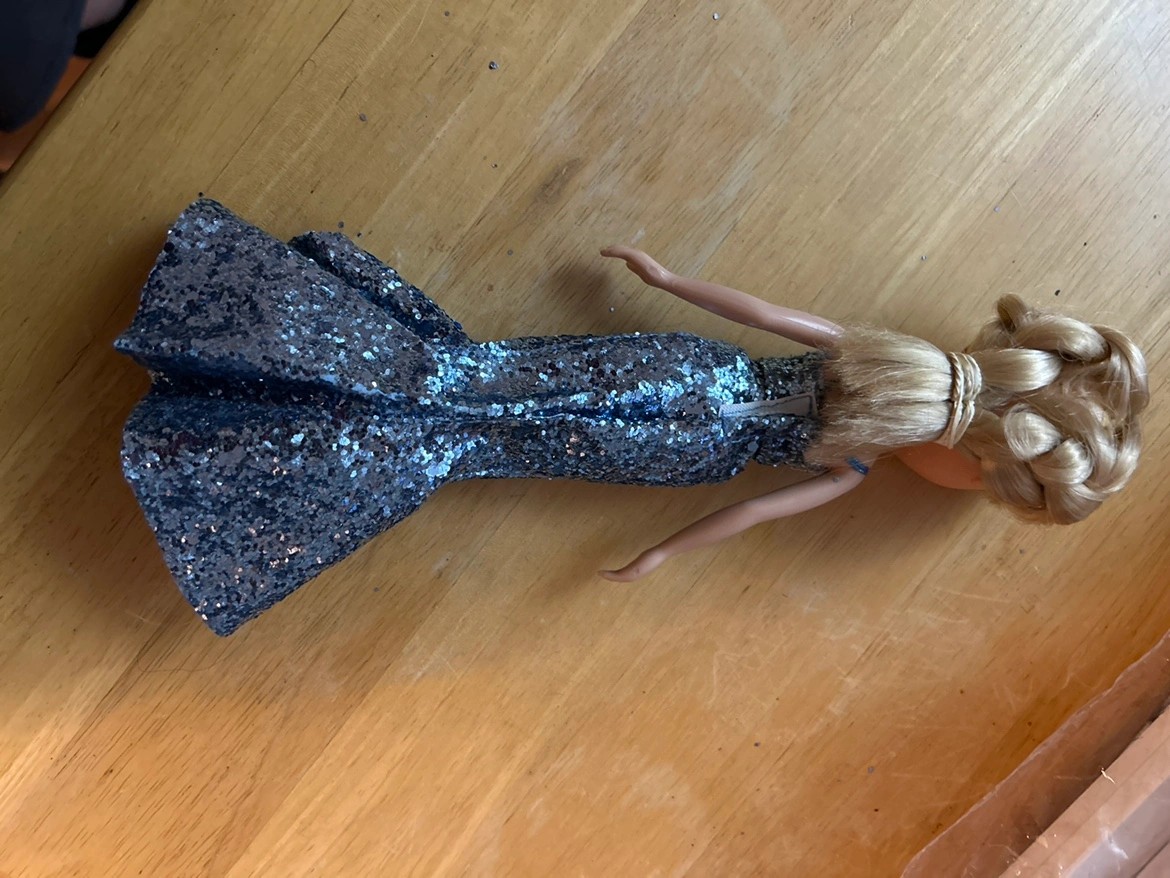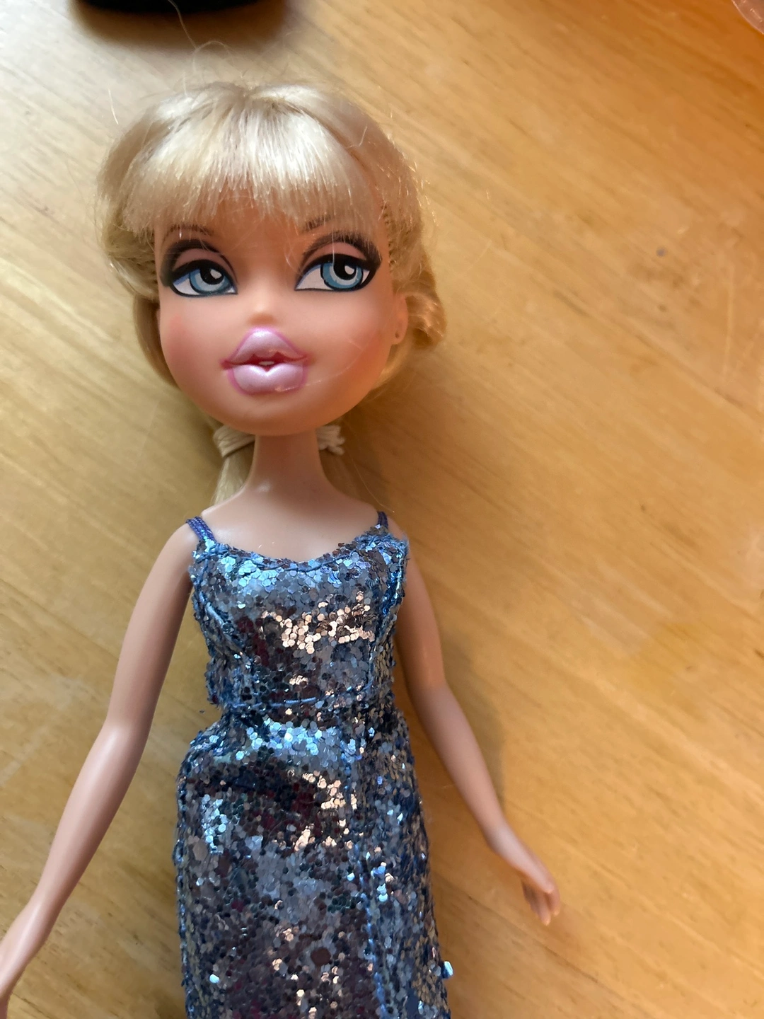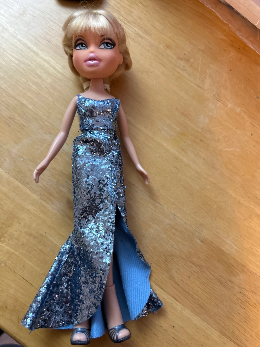 767Bratz doll wearing a handmade silver sparkly gown. High-low hemline. Doll features blonde hair in a ponytail and bangs. Includes shoes.