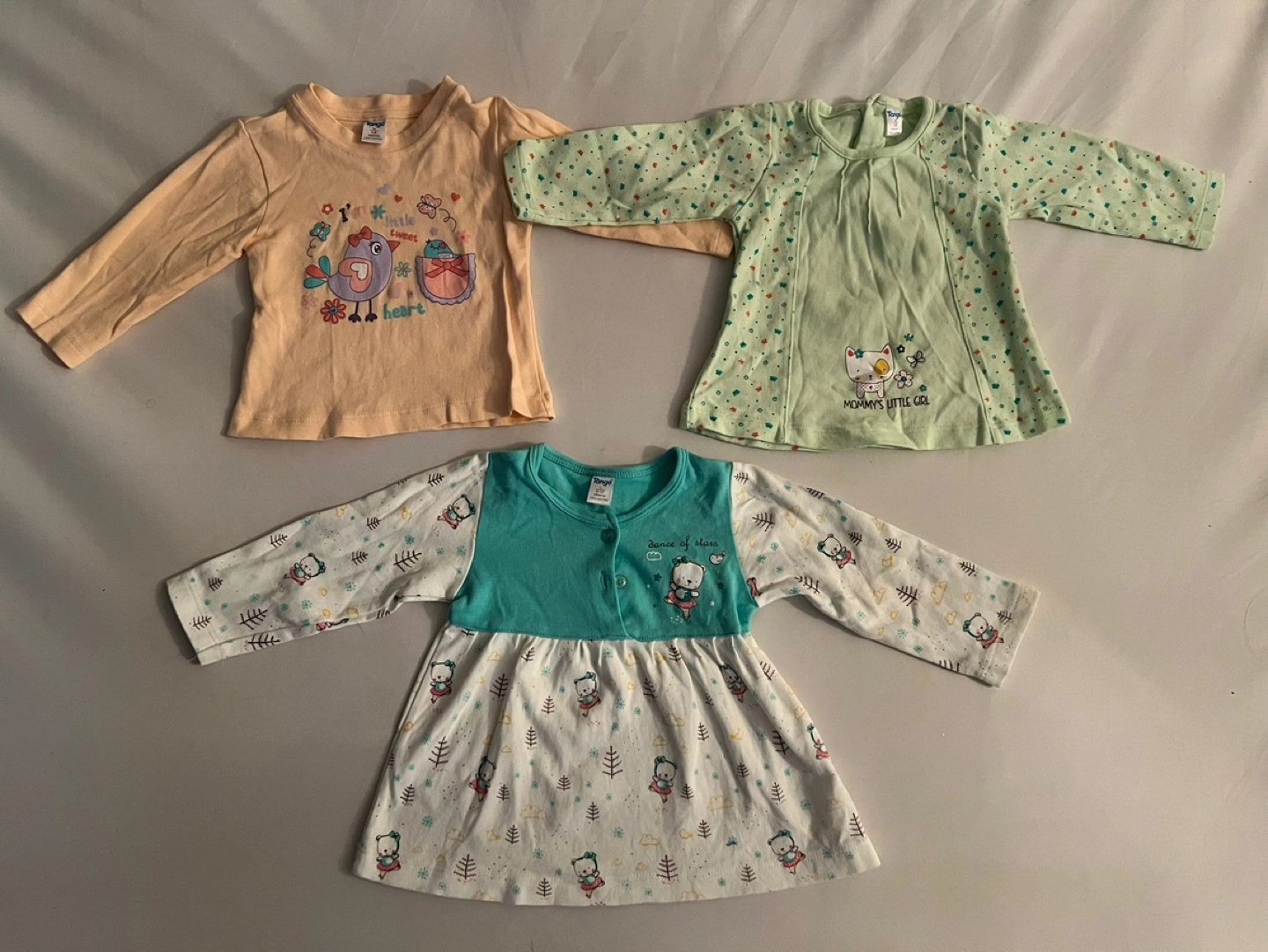 Price: $8 CAD for all 3 ✔ Cute and colorful prints ✔ Long sleeves – great for cooler weather ✔ Smoke-free, pet-free home. ✔ Sizes: • Top left & top right: 3-6 months • Bottom dress: 6-12 months