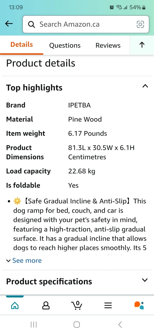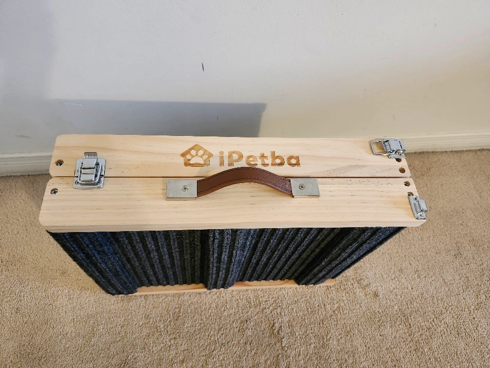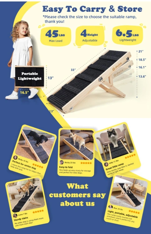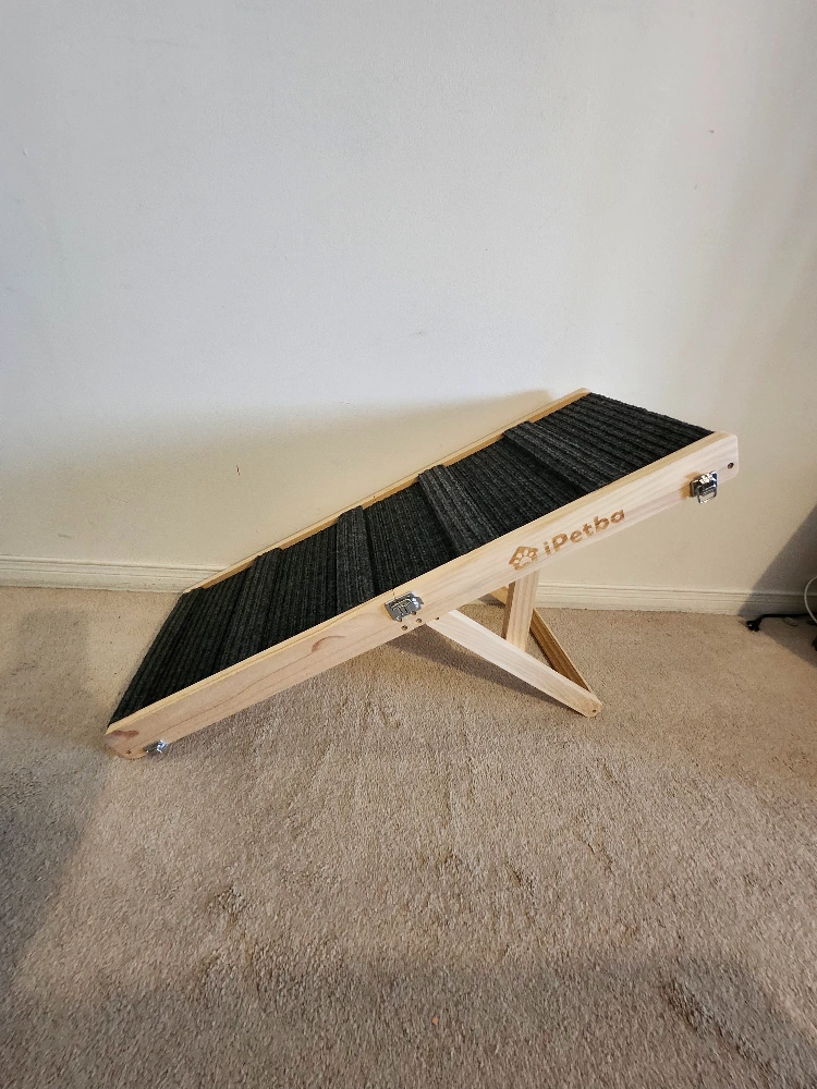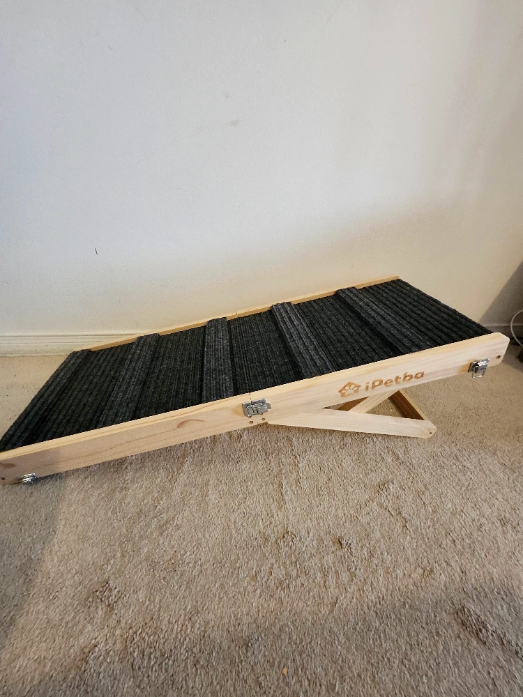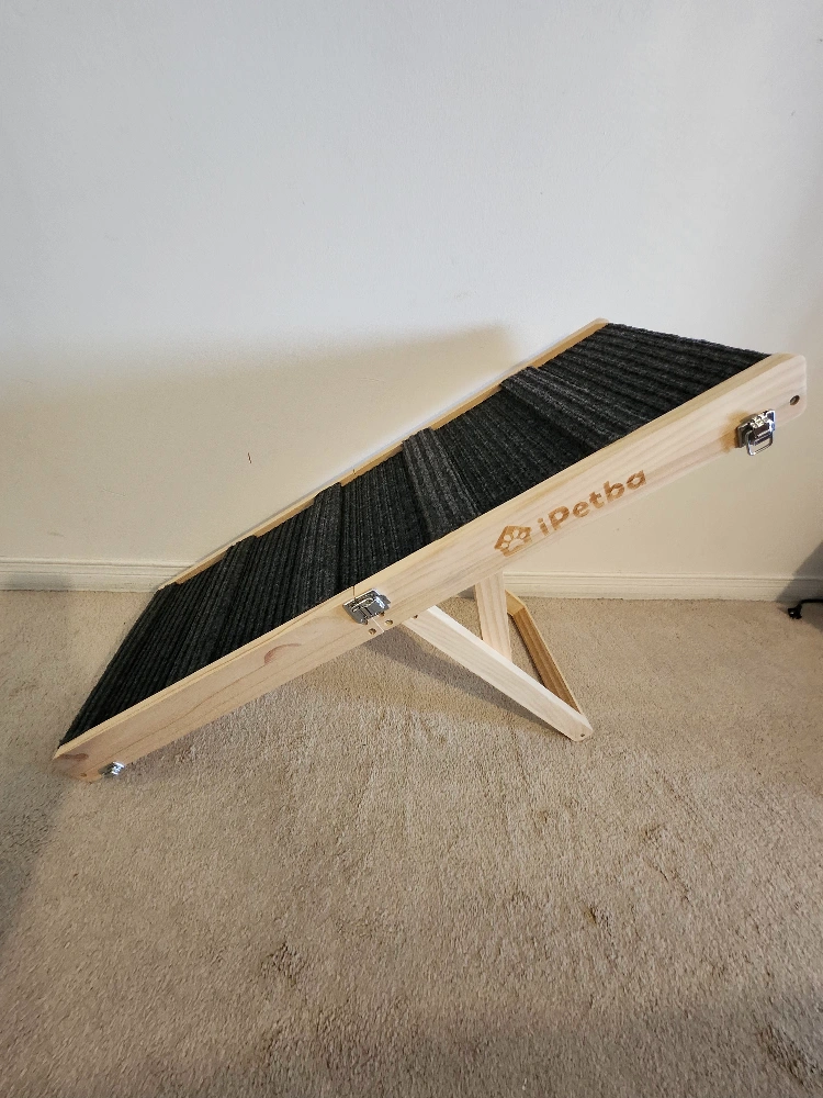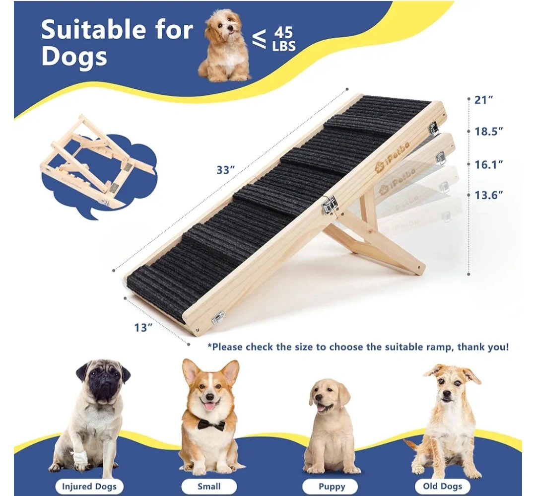 316Foldable pet ramp. Wooden construction. Safe carpet surface, Anti- Slipe. Easy to store. Includes carry handle. Suitable for dogs and cats. Adjestabale in 5 level , 21 inch Height load capacity 22.68k item weight 6.17 Lb 81.38 L × 30.5 W× 6.1 H Cantimetres