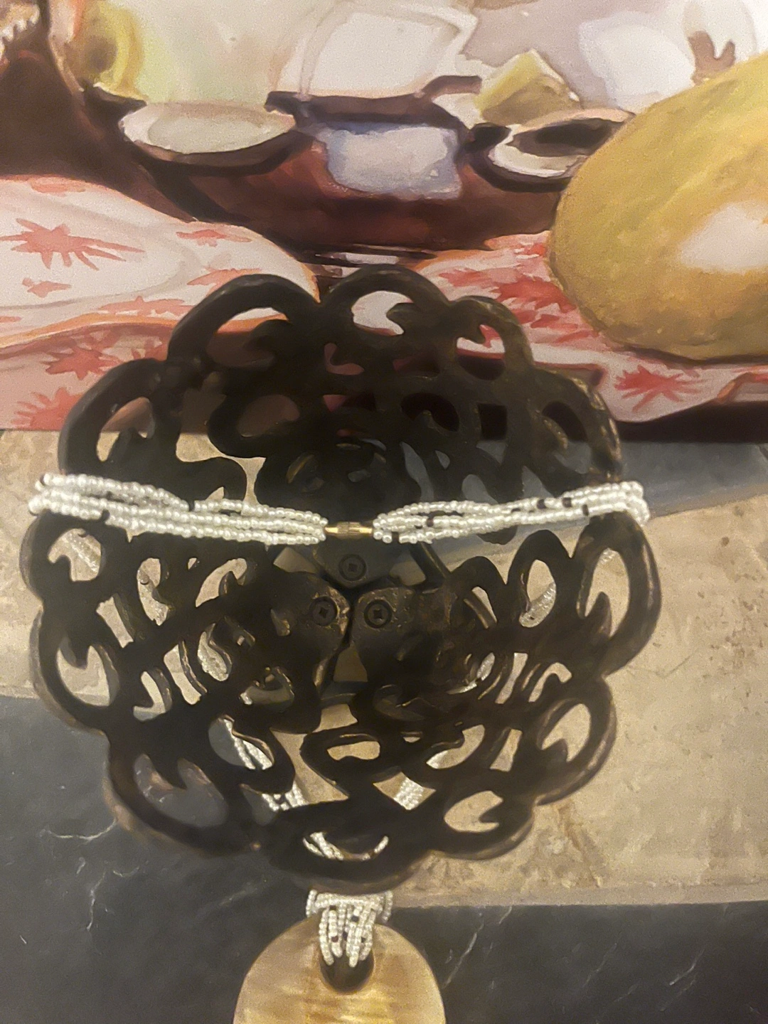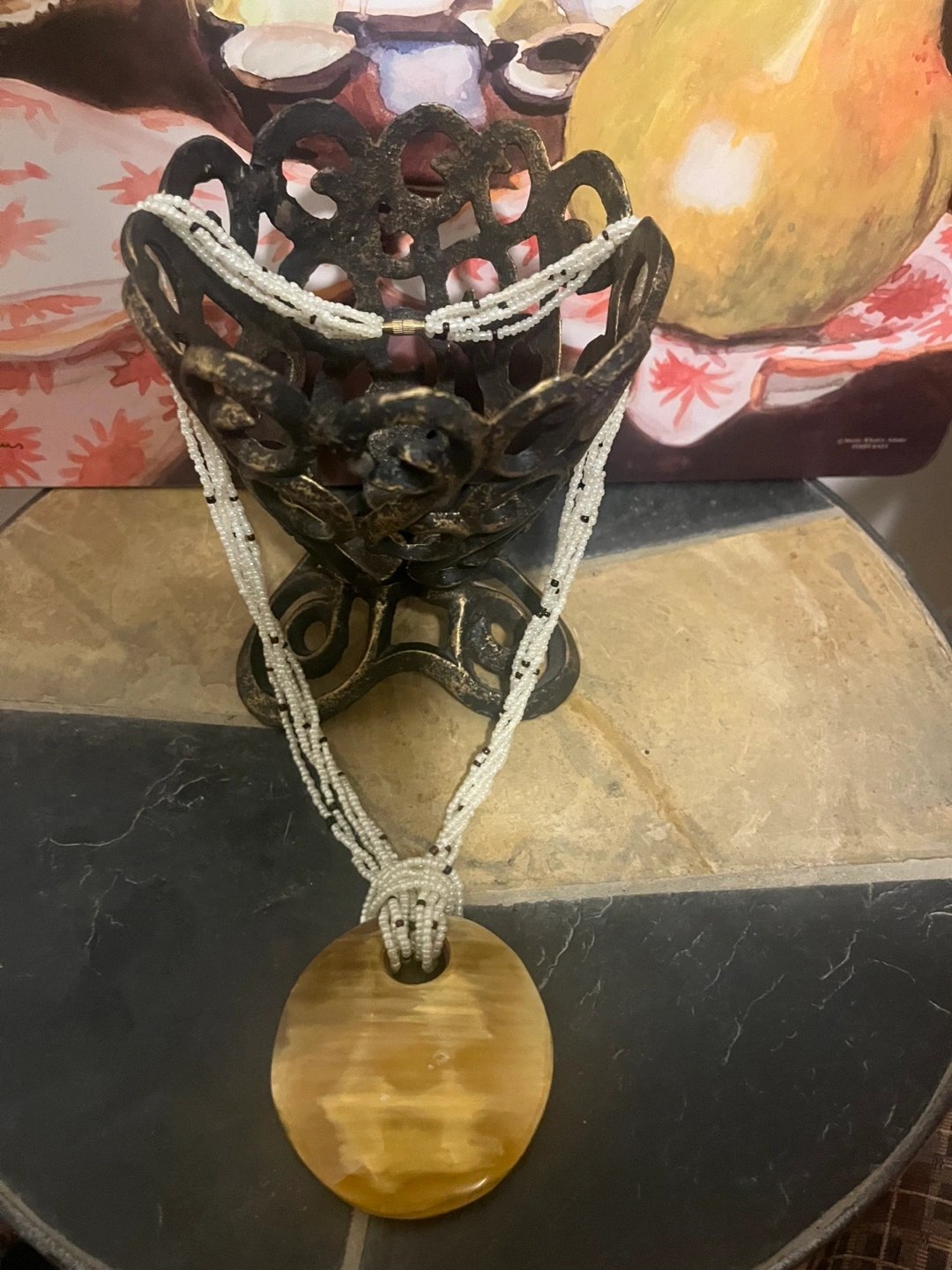 Multi-strand beaded necklace featuring small white and dark beads. Large, round, light brown pendant. Looks like horn or shell. Elegant and eye-catching.