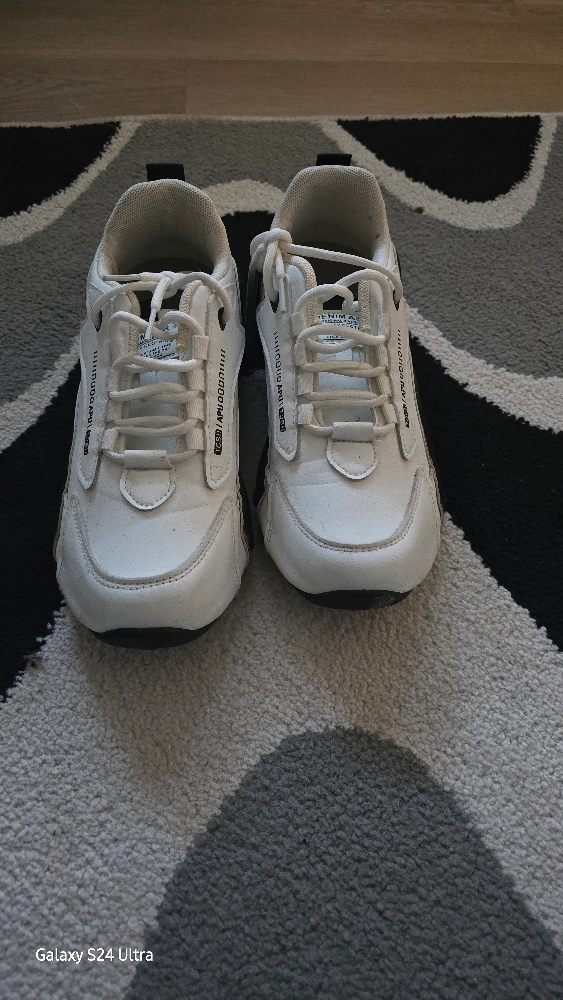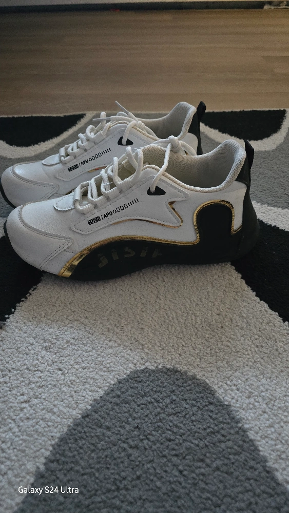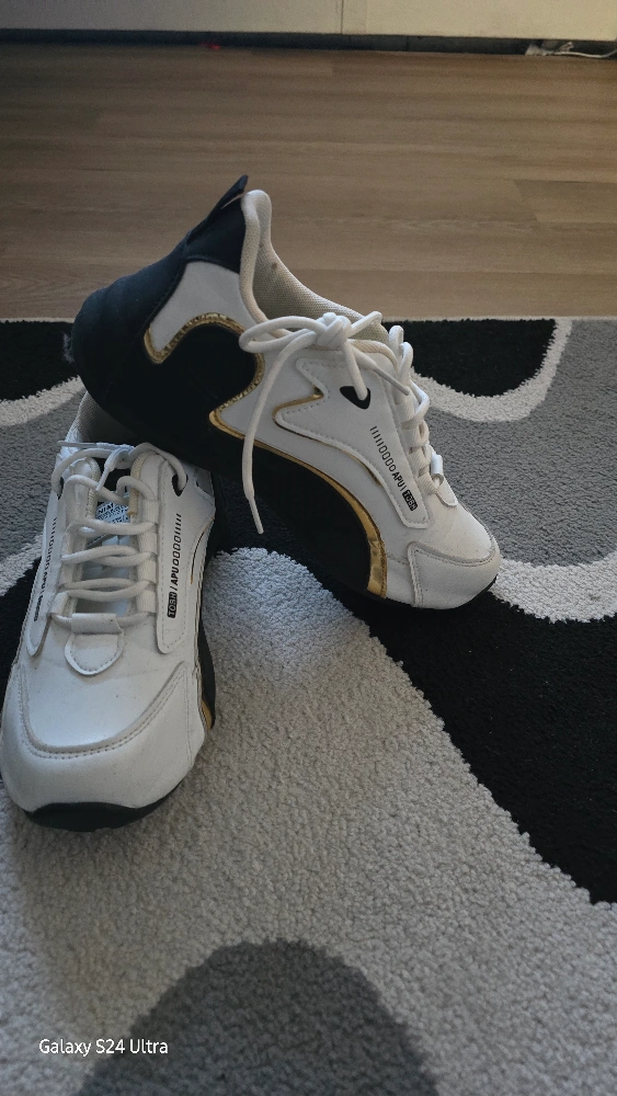 Pair of white sneakers with black accents. Gold detailing on the side. Lace-up closure. Appear to be in good condition. Good for casual wear.