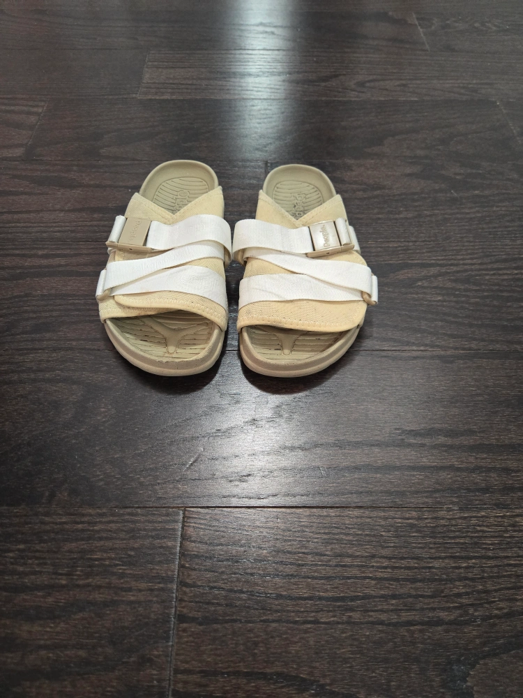 677Pair of beige velcro sandals. Comfortable and stylish. Good for summer.