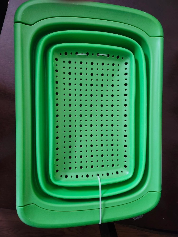 Three-tier collapsible plastic colander. Great for washing vegetables or other produce. Bright green colour. Space saving design. brand new, never used