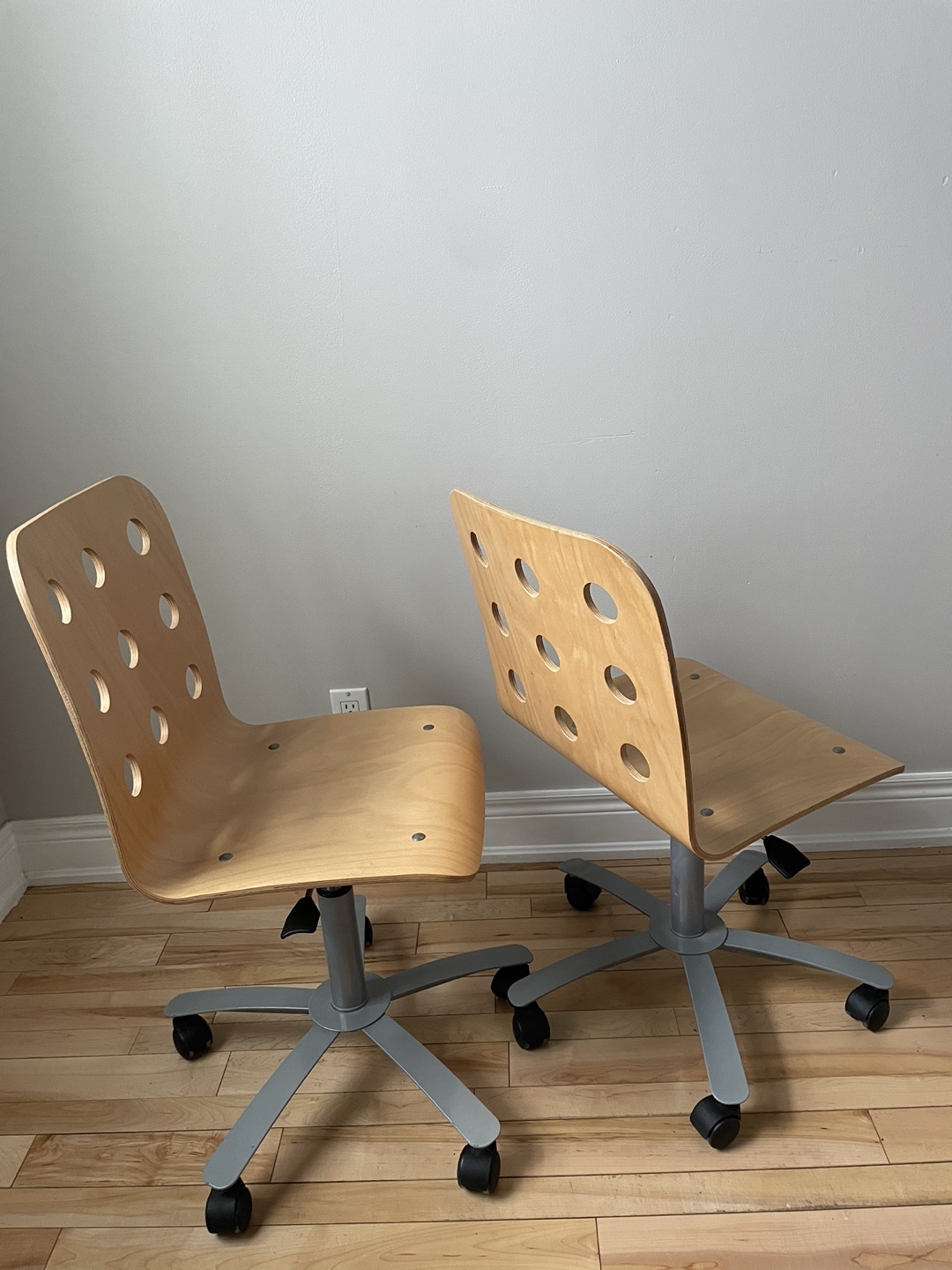 I’m selling two matching IKEA Jules pressed wood swivel chairs. Adjustable height. Five-star base with wheels. Cut-out detailing on the back.
