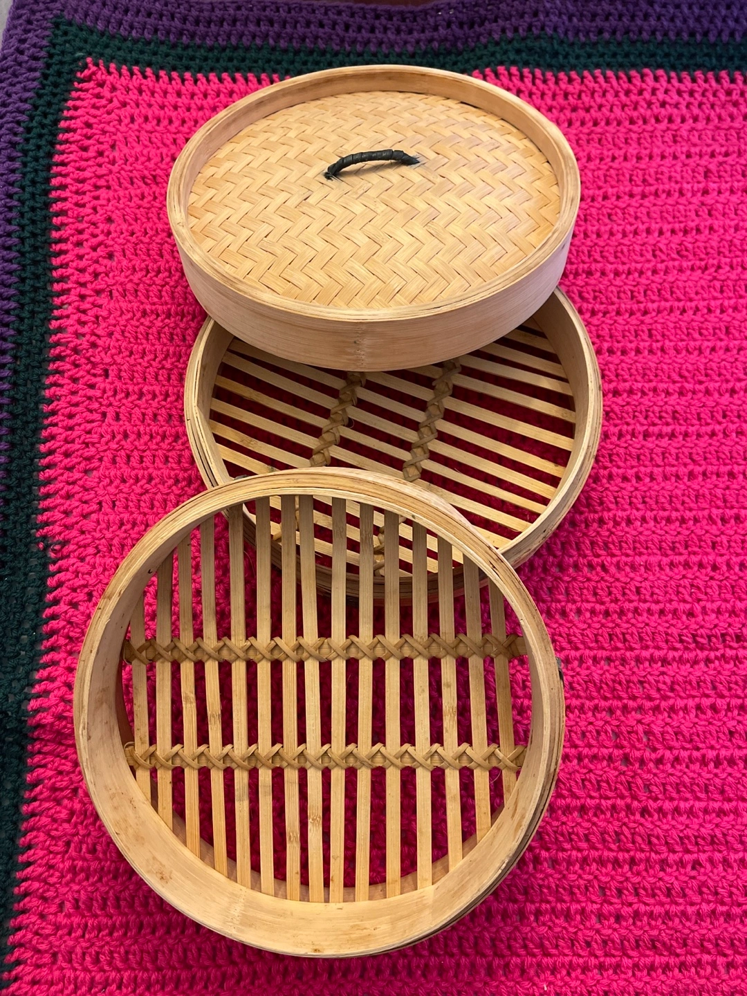 Two-tiered bamboo steamer. Great for steaming vegetables, dumplings, or other foods. Natural bamboo construction.