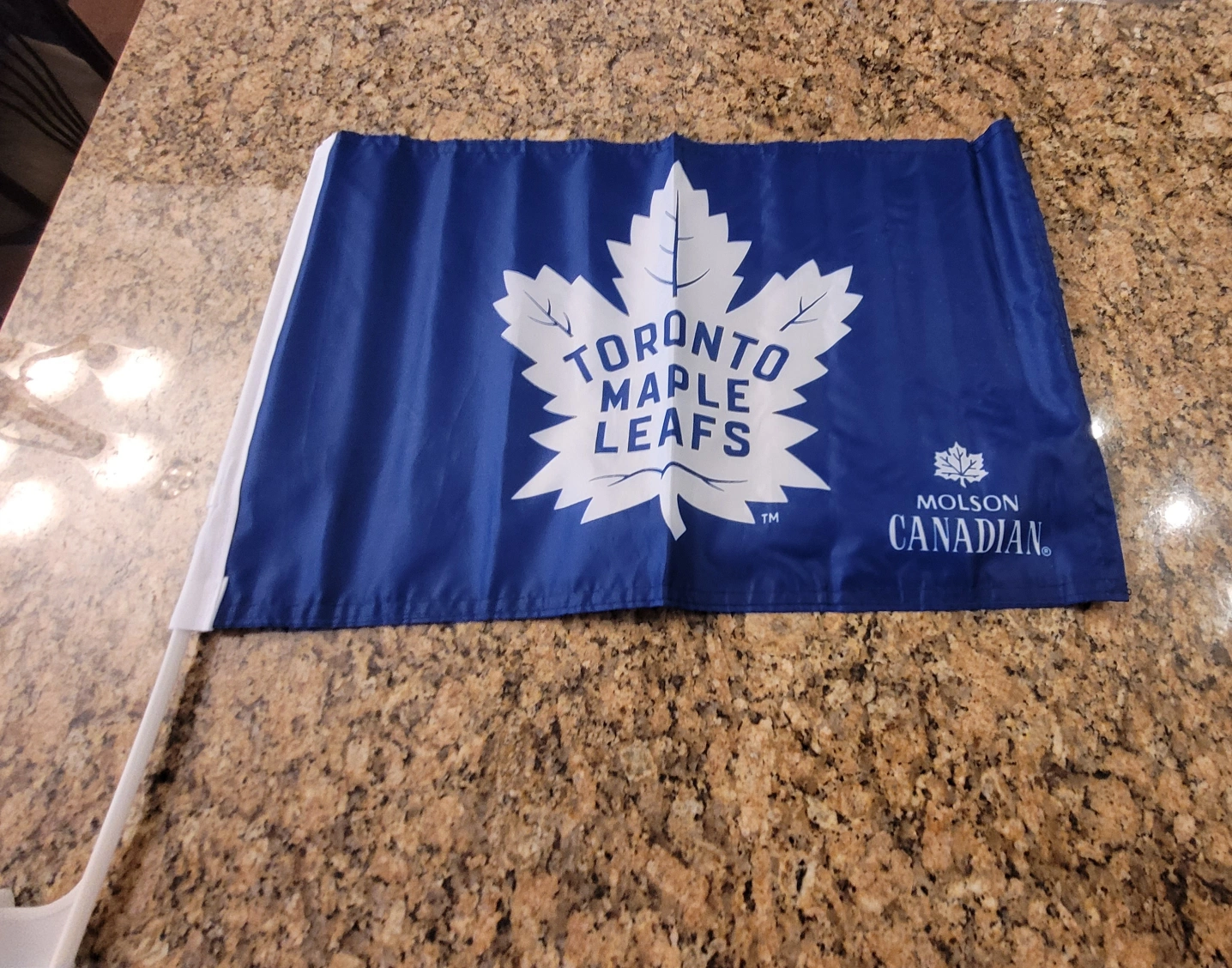New Toronto Maple Leafs car flag. Blue flag with white Maple Leafs logo. Molson Canadian branding. Includes car flag attachment.