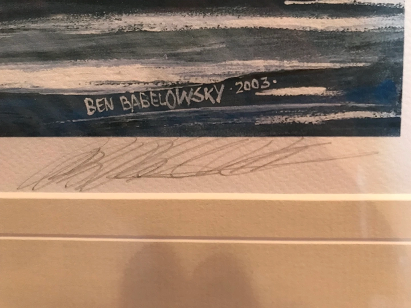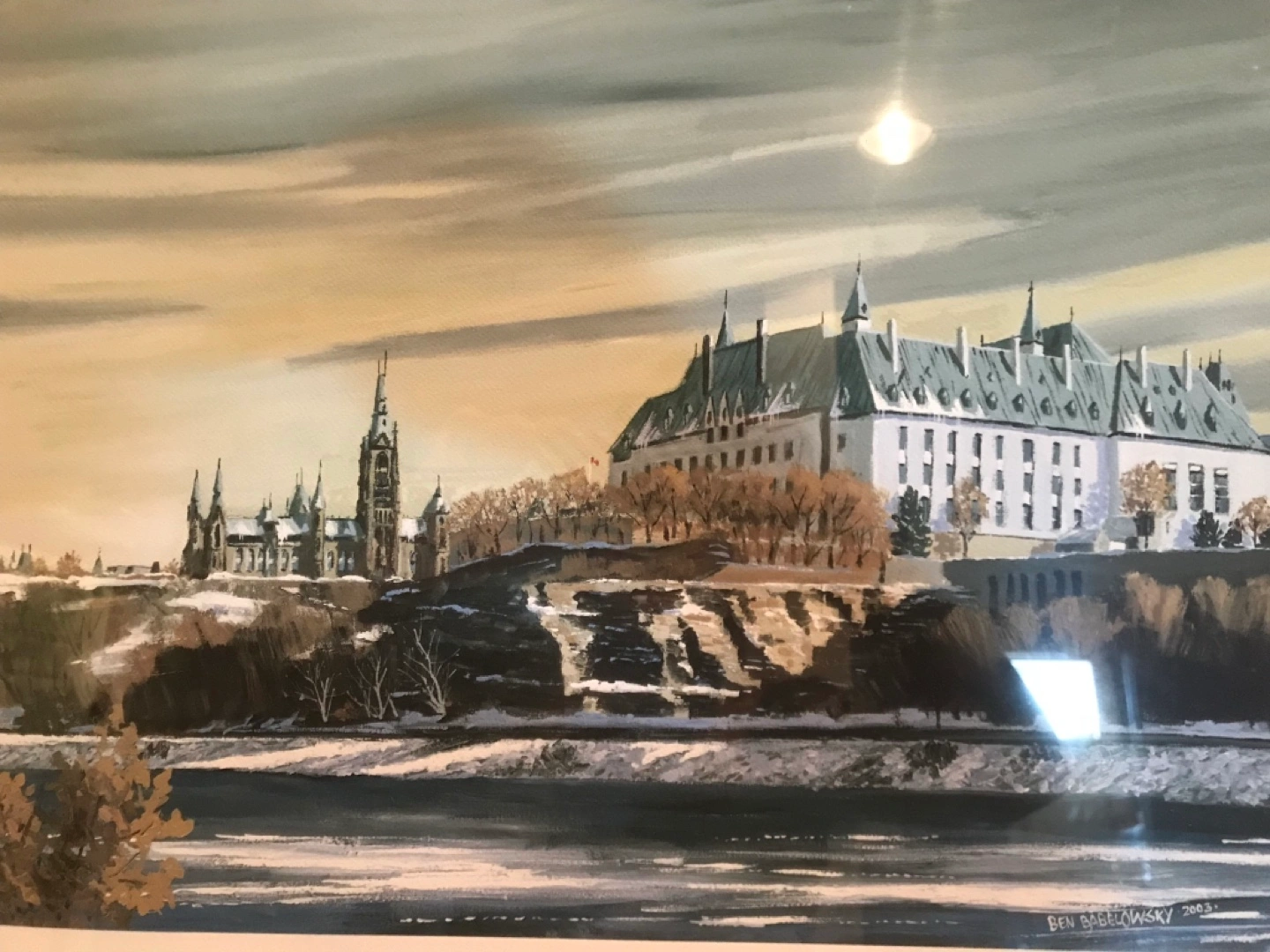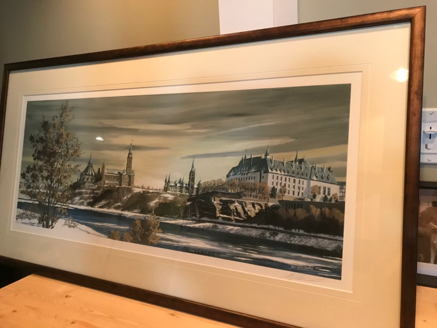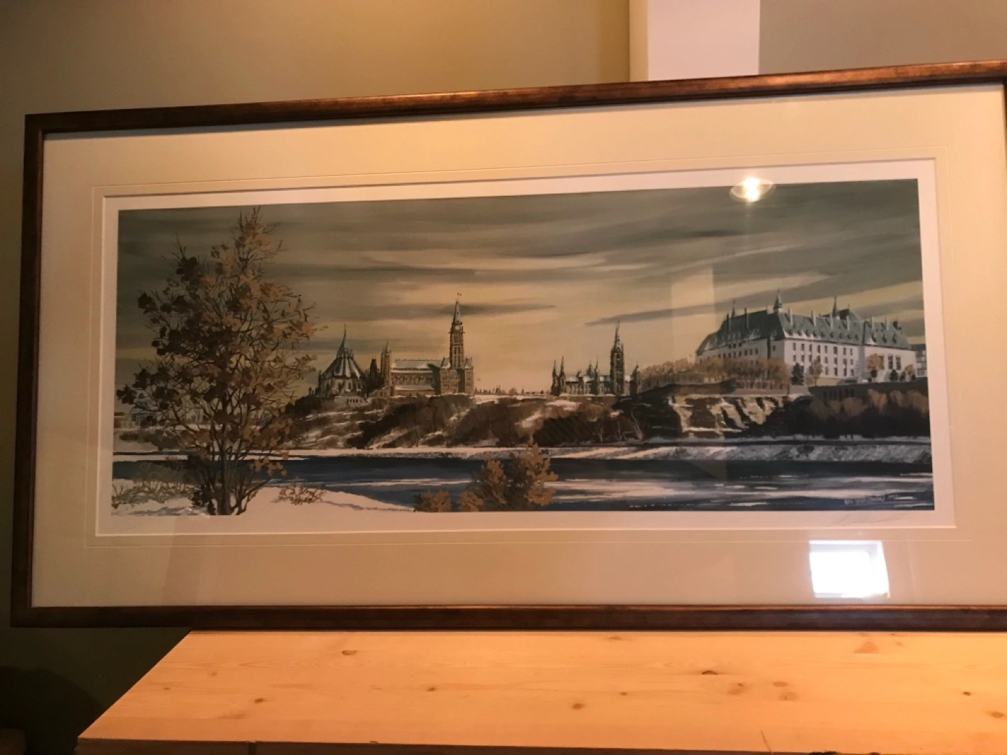 Large framed print of the Ottawa skyline in winter. Beautiful colours and detail. Signed and dated 2003 by the artist. Nicely framed in dark wood.