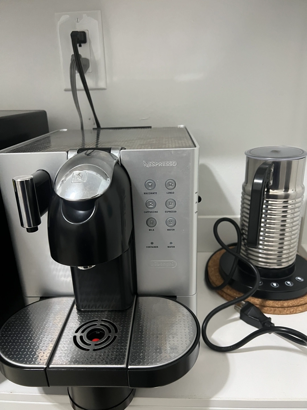 Nespresso machine with milk frother and 22 decaf pod boxes with expiry in 2026.