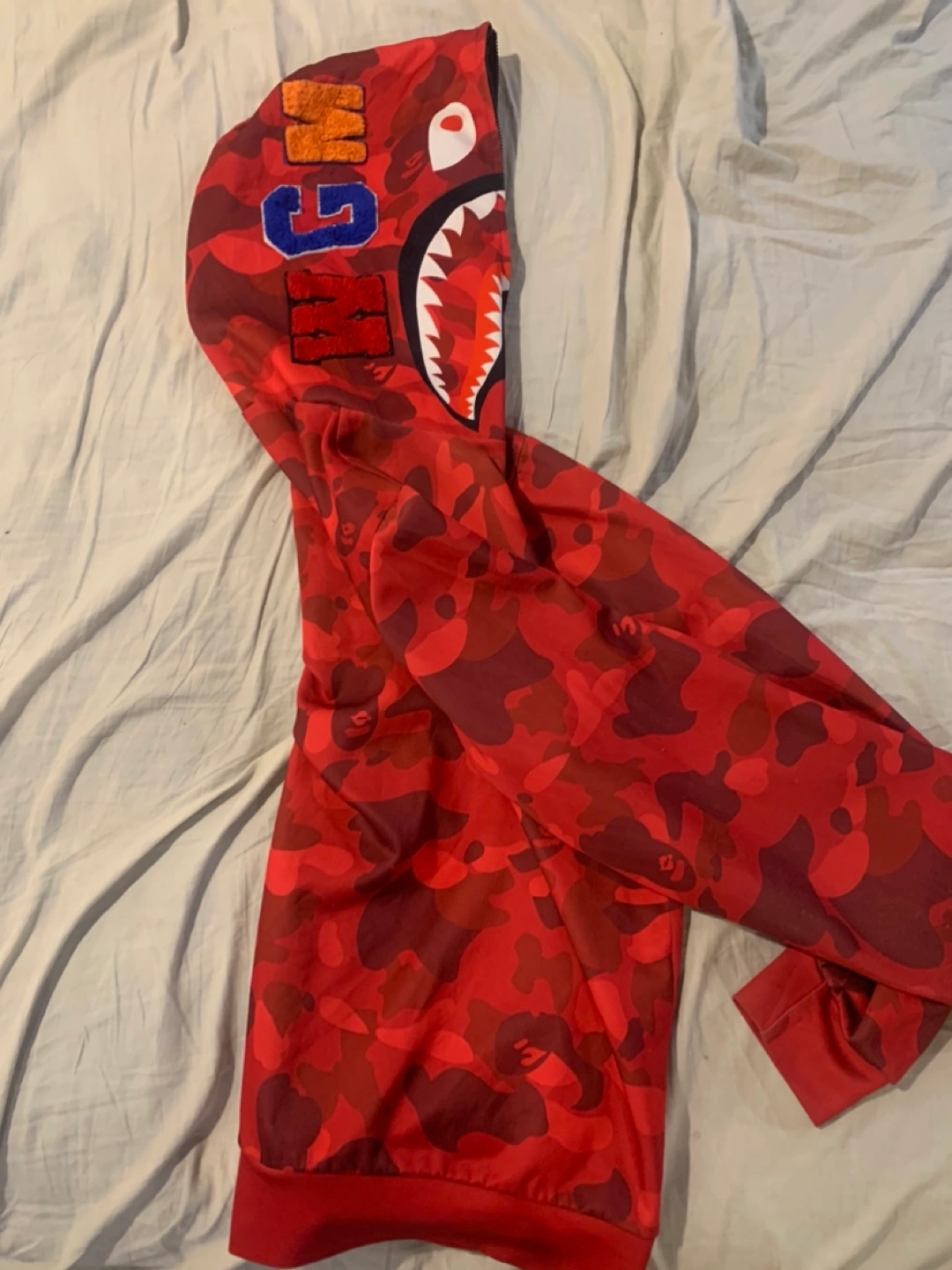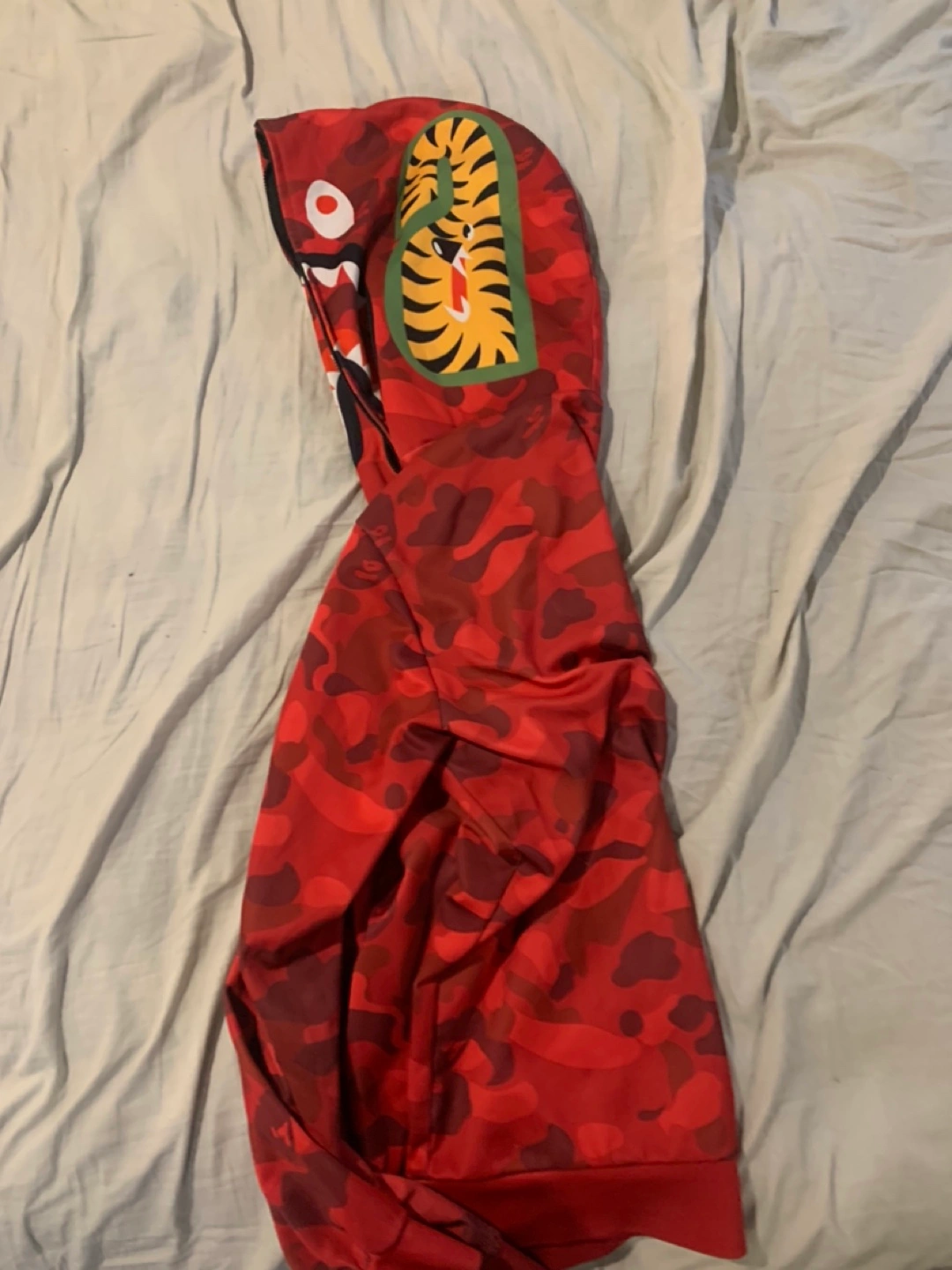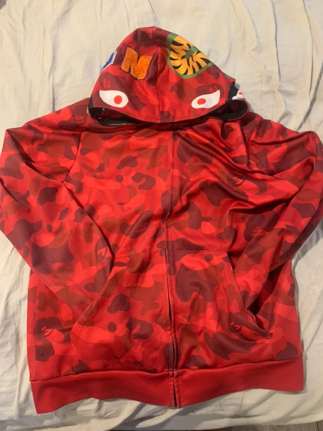 36Men's red camo zip-up hoodie. Features a large shark face on the hood. Full zip closure. Long sleeves. Excellent condition.