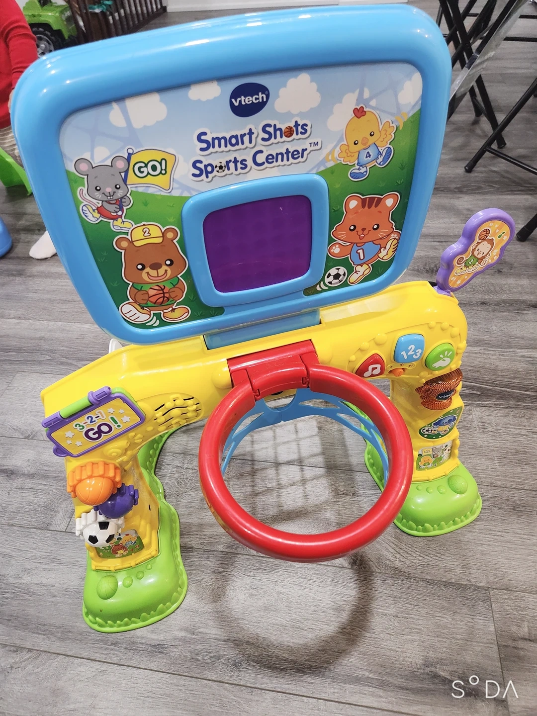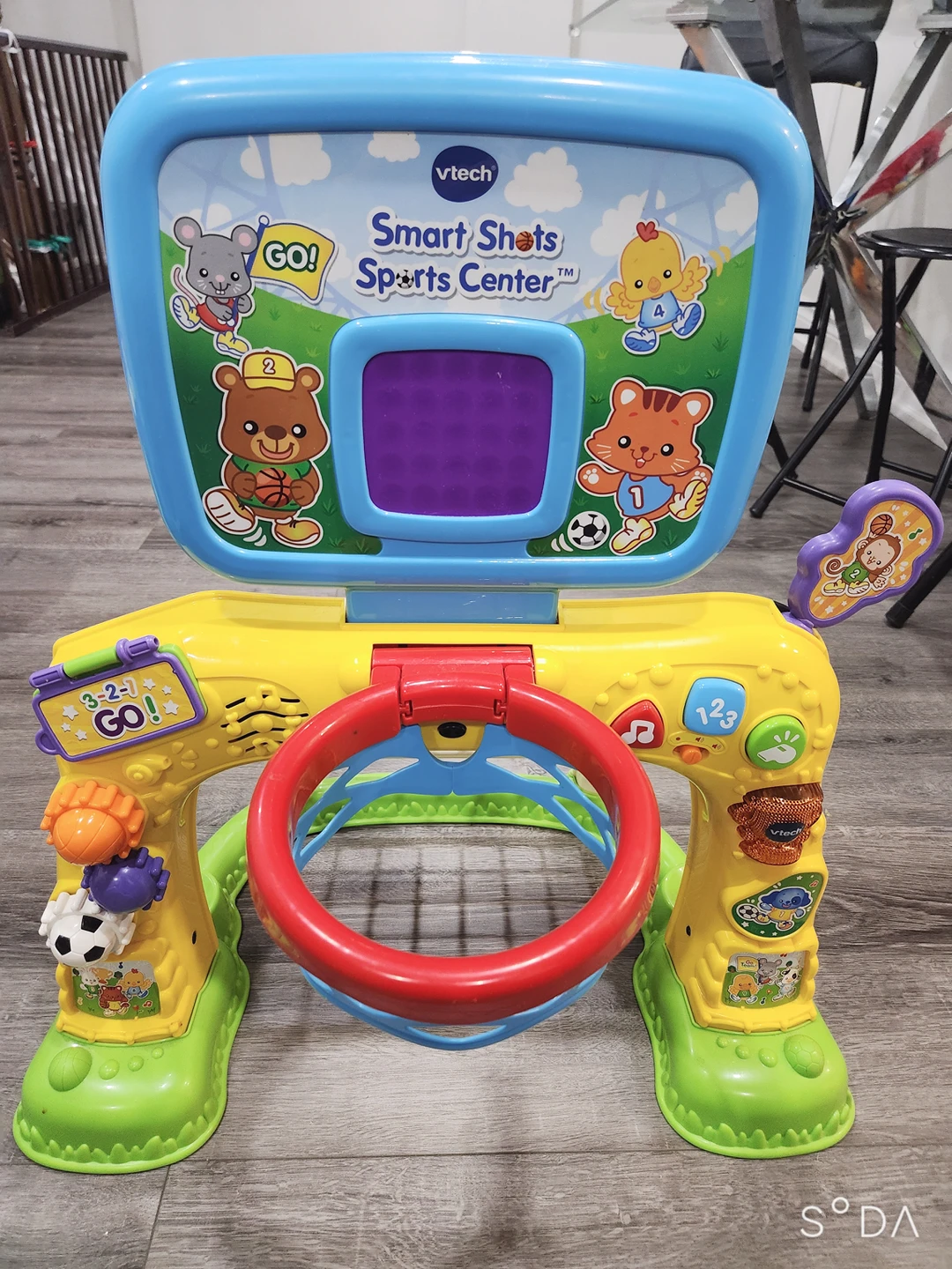 This 2-in-1 basketball hoop and soccer goal provides interactive learning by introducing shapes and numbers while playing with a cool sports toy