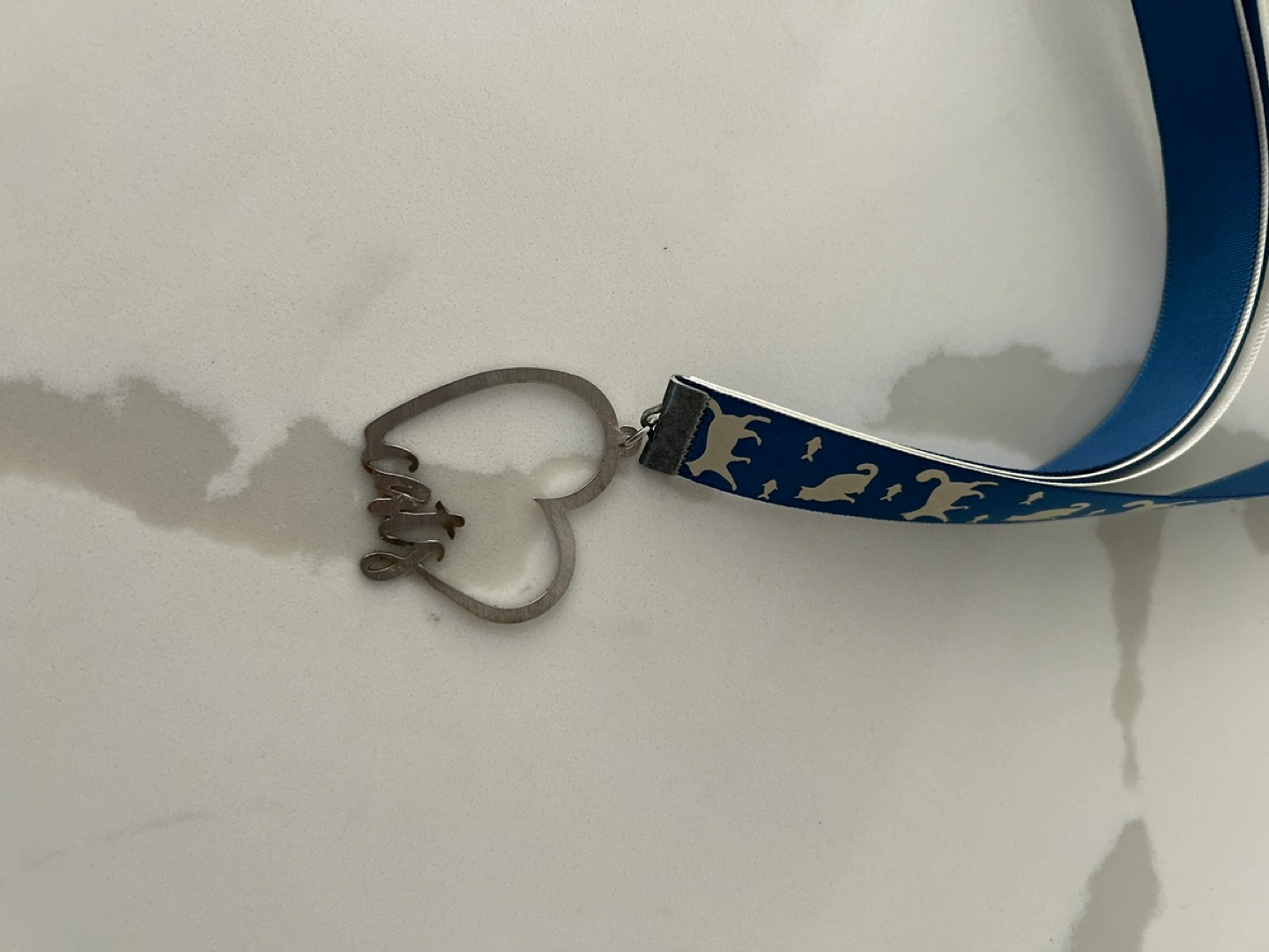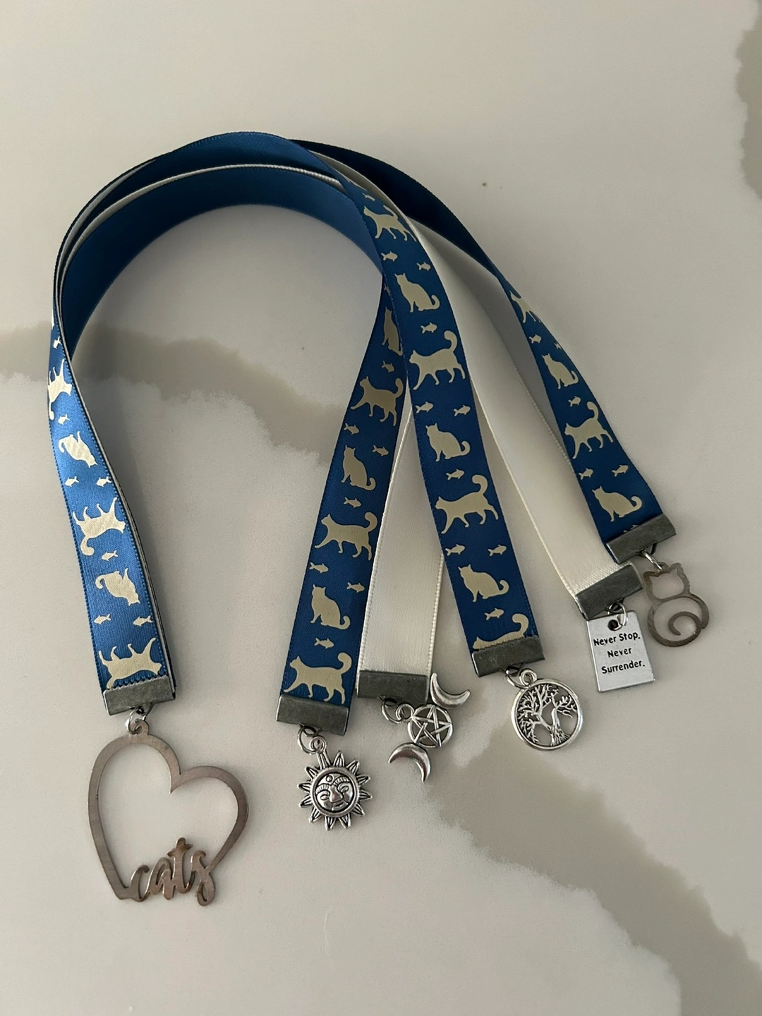 Ribbon bookmarks. Features a repeating cat pattern. Includes various charms. Metal heart charm says "cats". This particular piece is a 5 page bookmark.