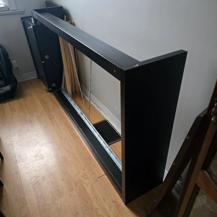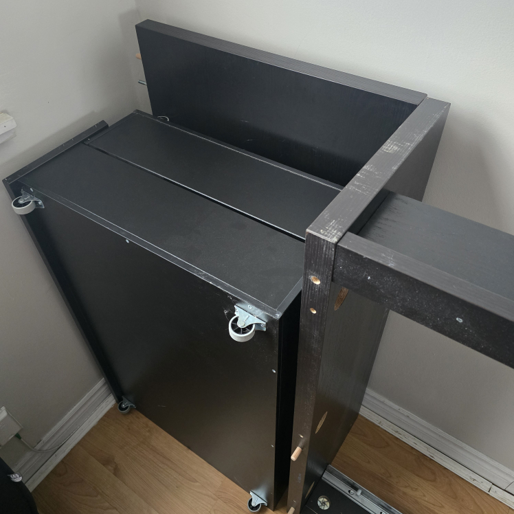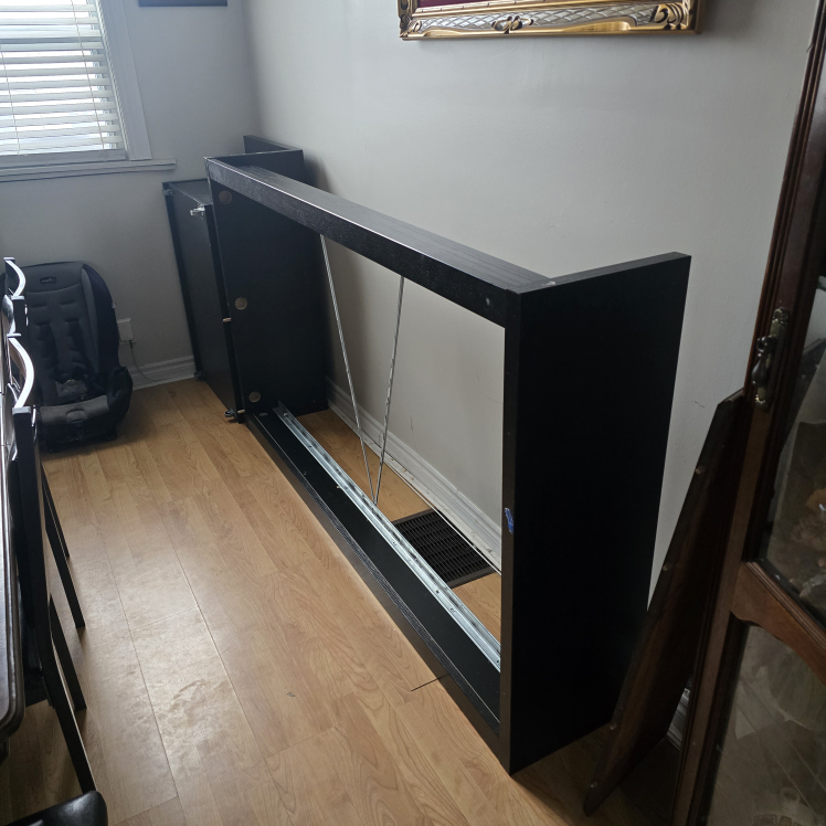 Dark brown/black single bed frame. 2 large pull-out drawers. Partially headboard only disassembled. Some minor wear. $70 if it can be picked up tonight.