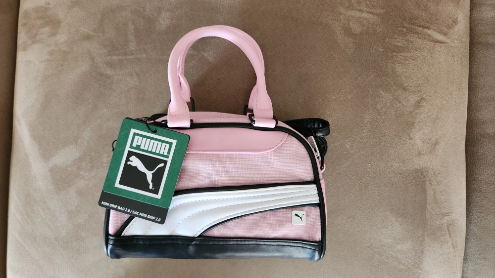 Adorable mini bag. Pink with white and black accents. Small size, perfect for essentials. Features a top handle and shoulder strap. Pet-free, smoke-free home.