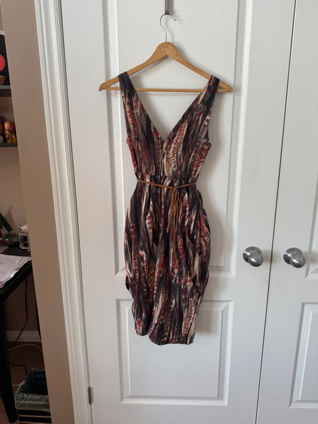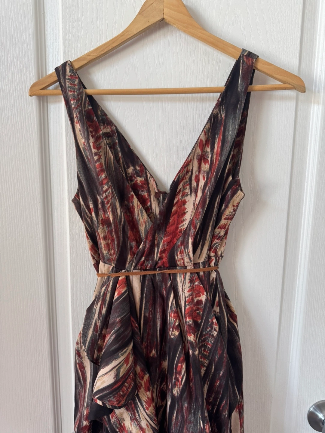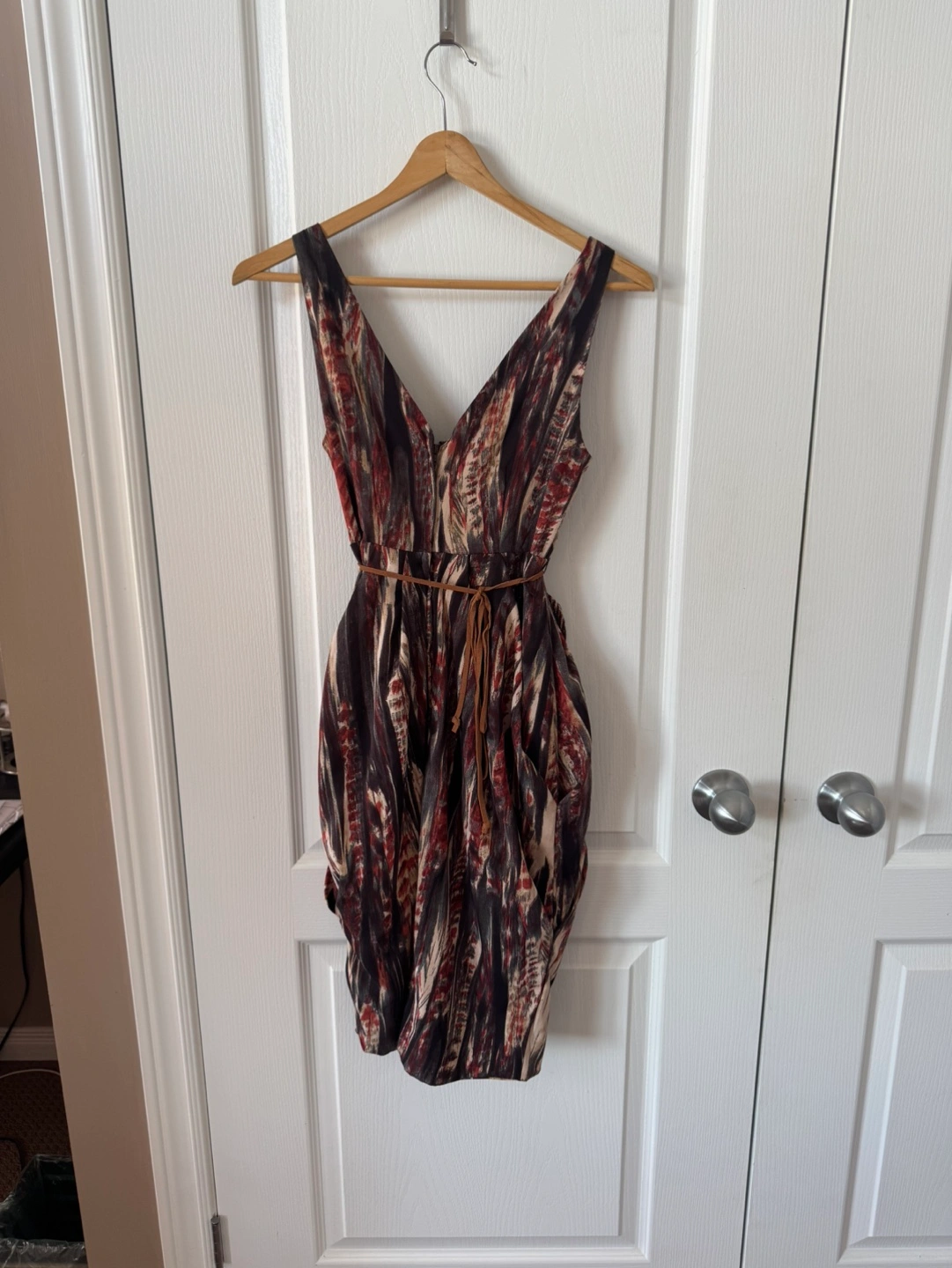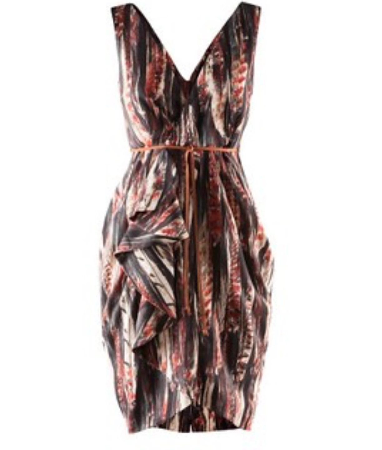 Sleeveless V-neck dress. Features a brown leather-like tie belt. Abstract print in dark colours. Casual or dressy occasion.