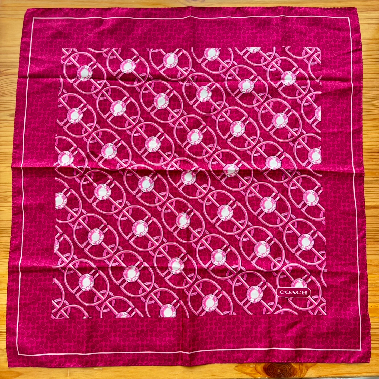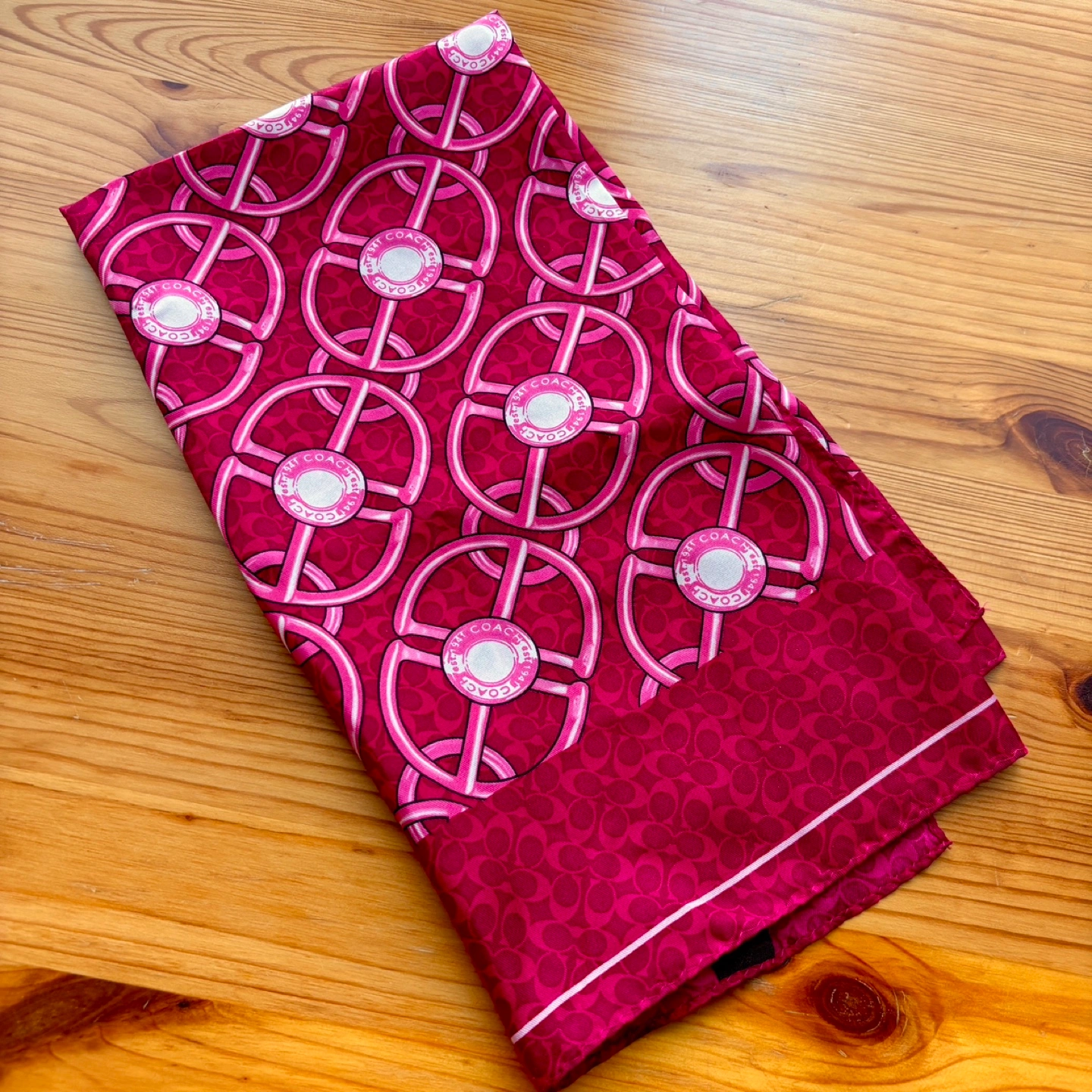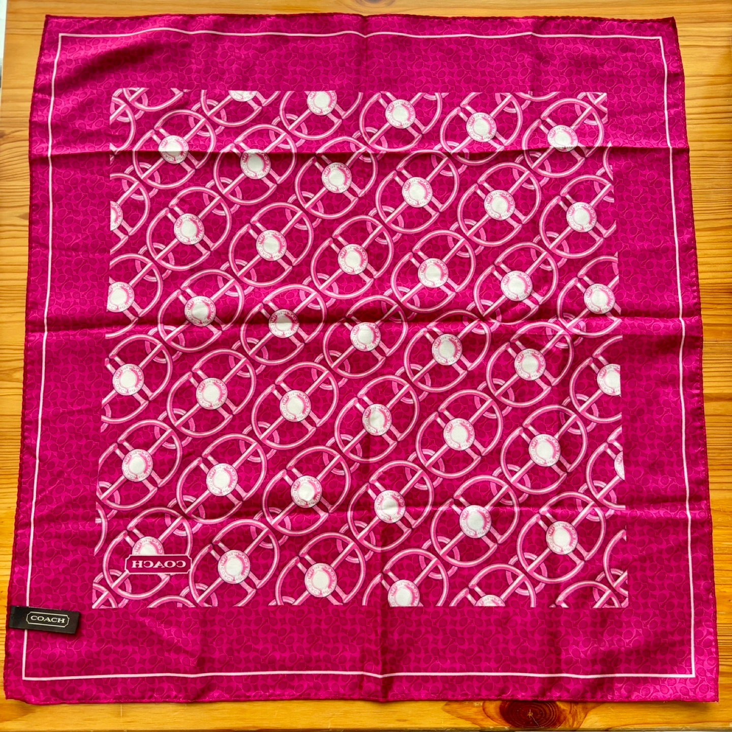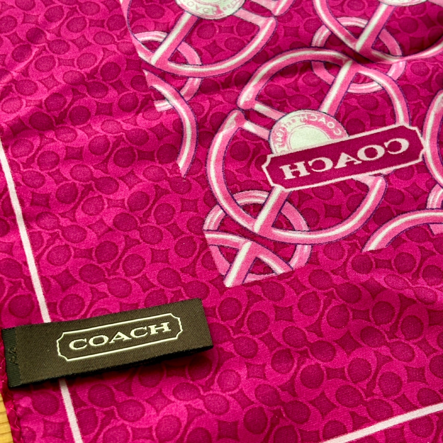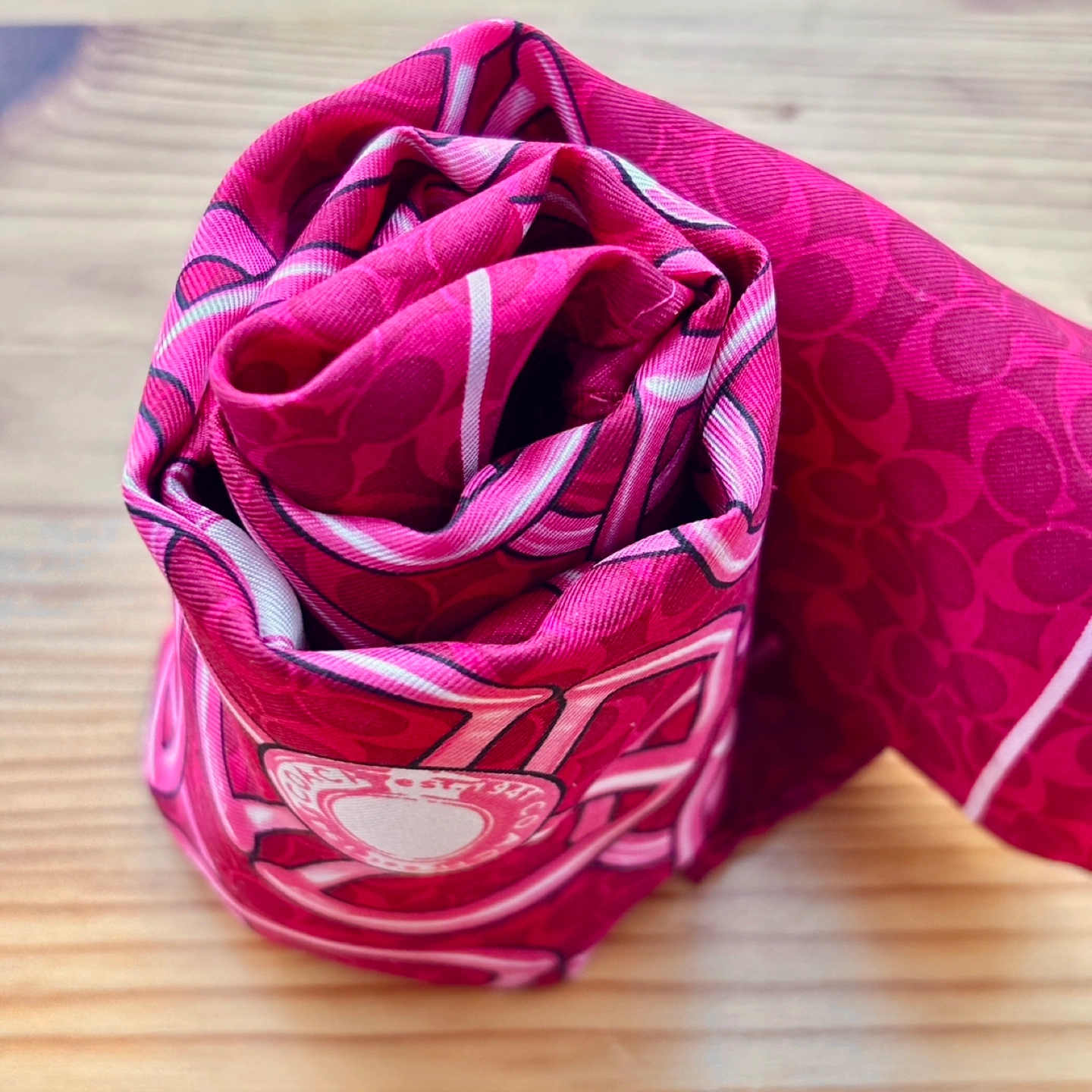 687Beautiful pink silk scarf. Features COACH logo pattern. Excellent brand new condition, never worn. Approx 21 x 21” Pick up at Dundas and River
