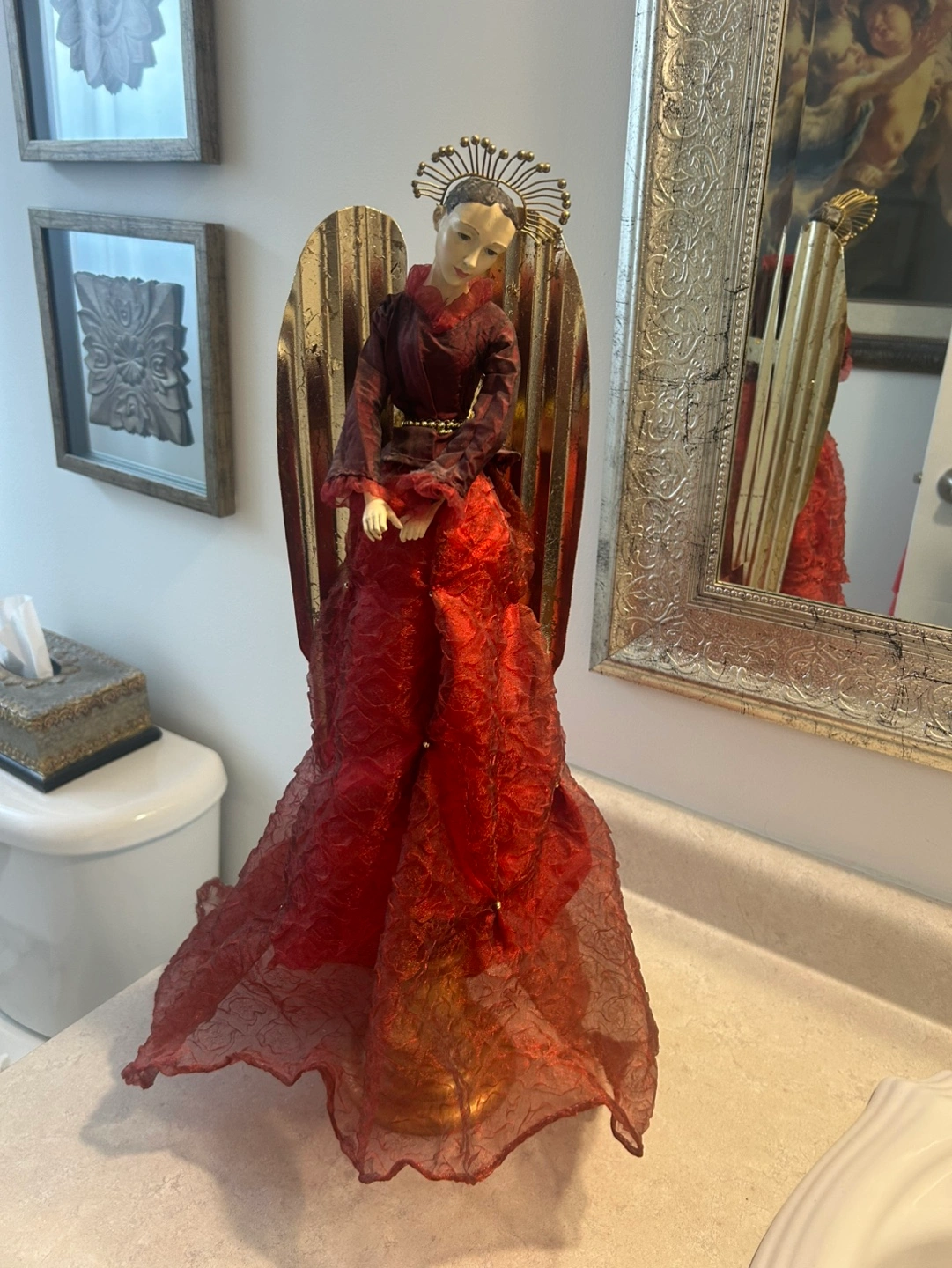 Beautiful red angel figurine. Gold wings and elegant dress. Perfect Christmas decoration. Approximately 20 inches tall.