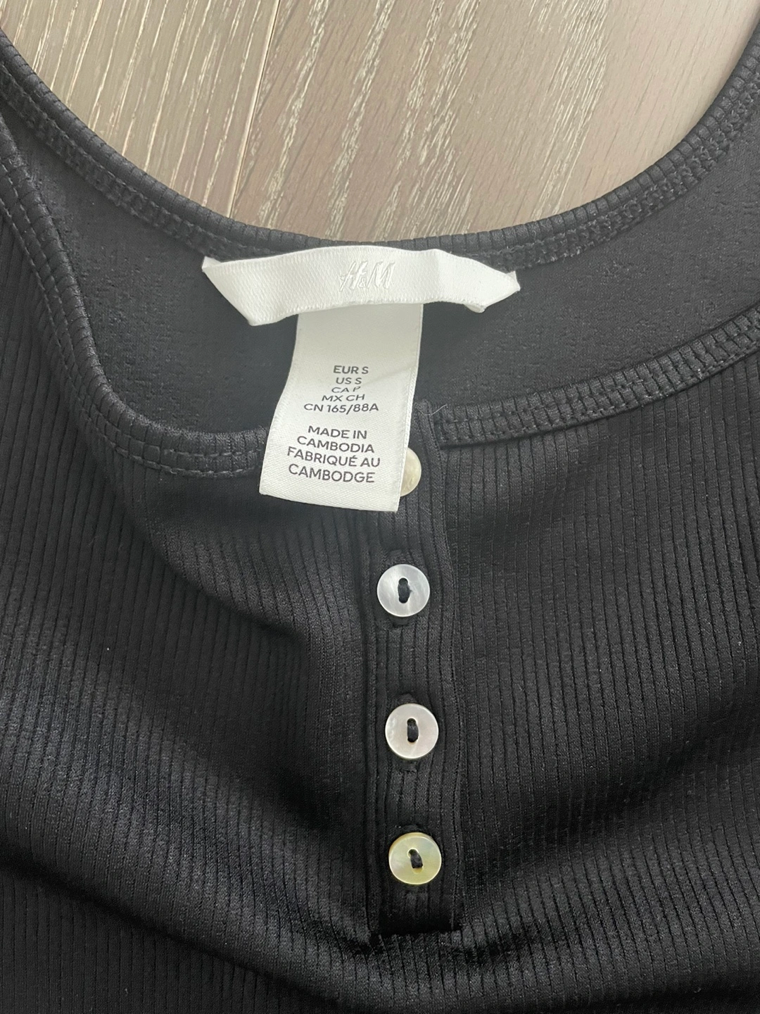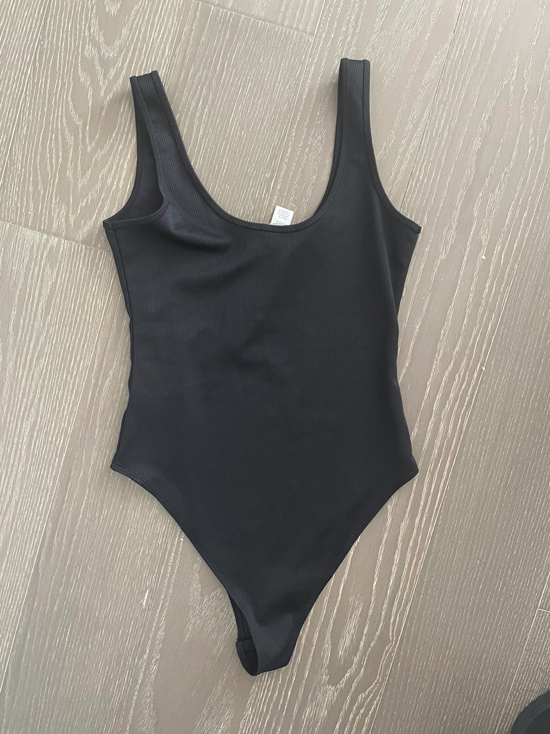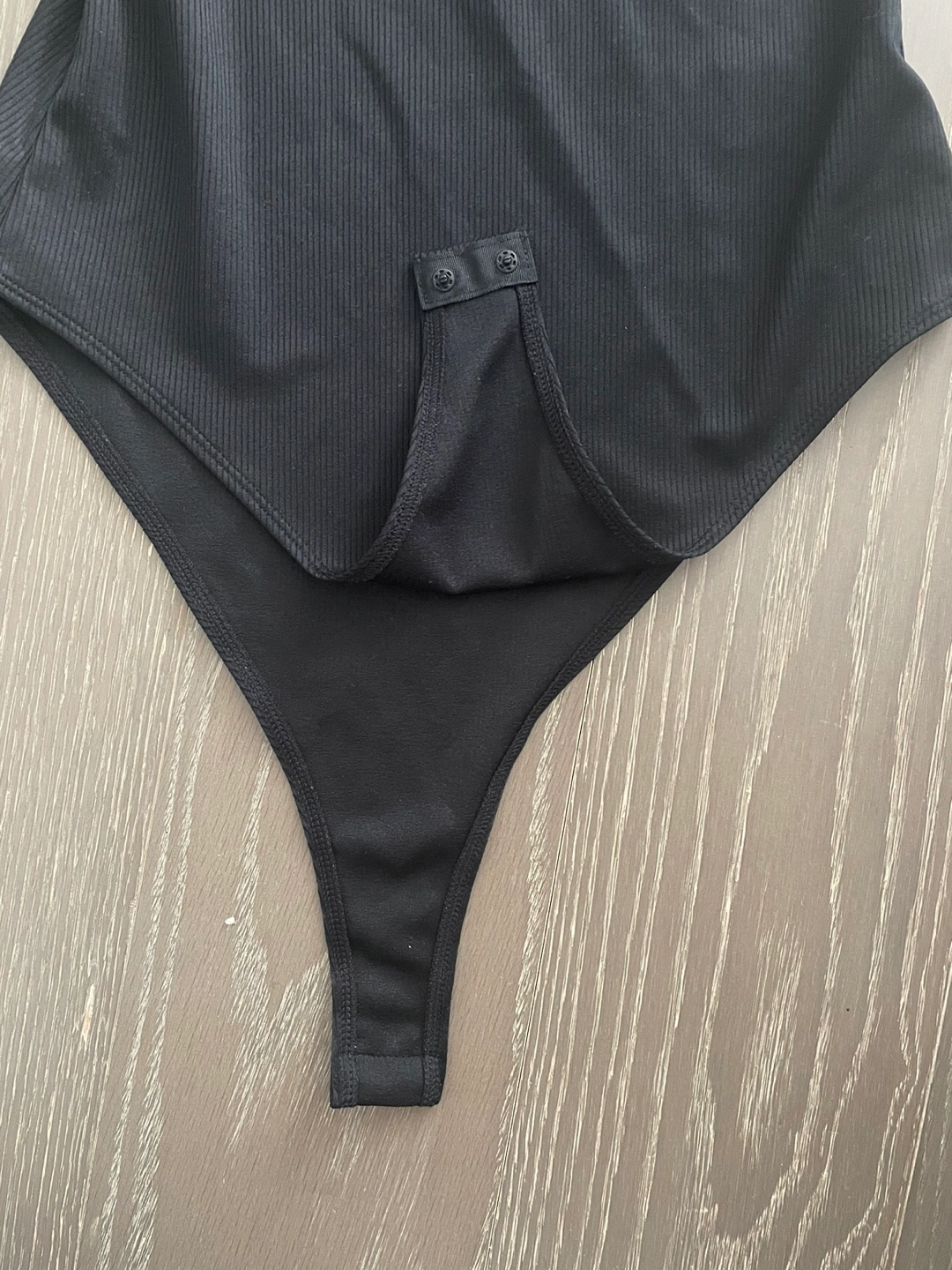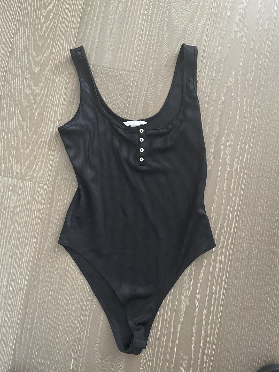 Black ribbed bodysuit. Size small. Features a button placket. Scoop neck. Classic bodysuit style. Good condition.
