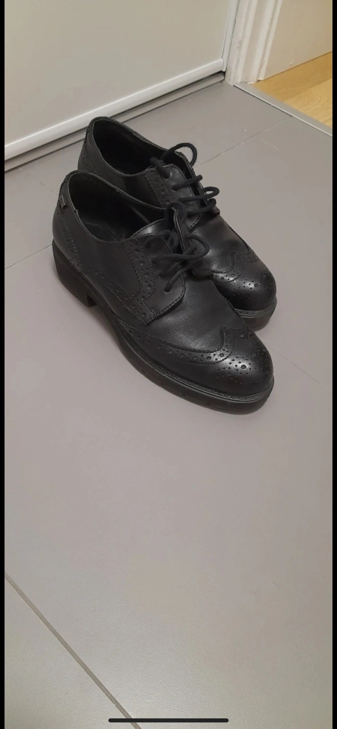 Pair of black leather brogue shoes. Lace-up style. Slightly worn. Great condition