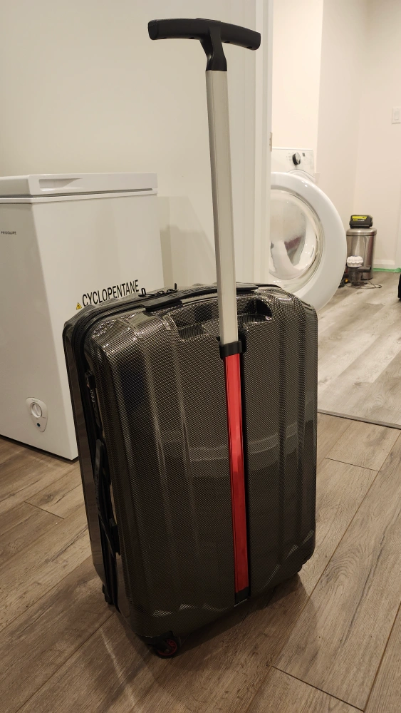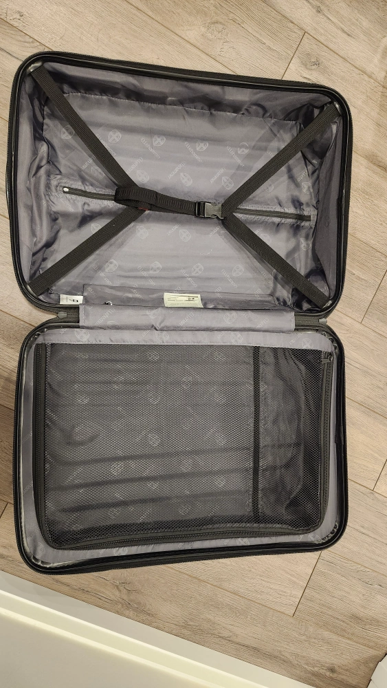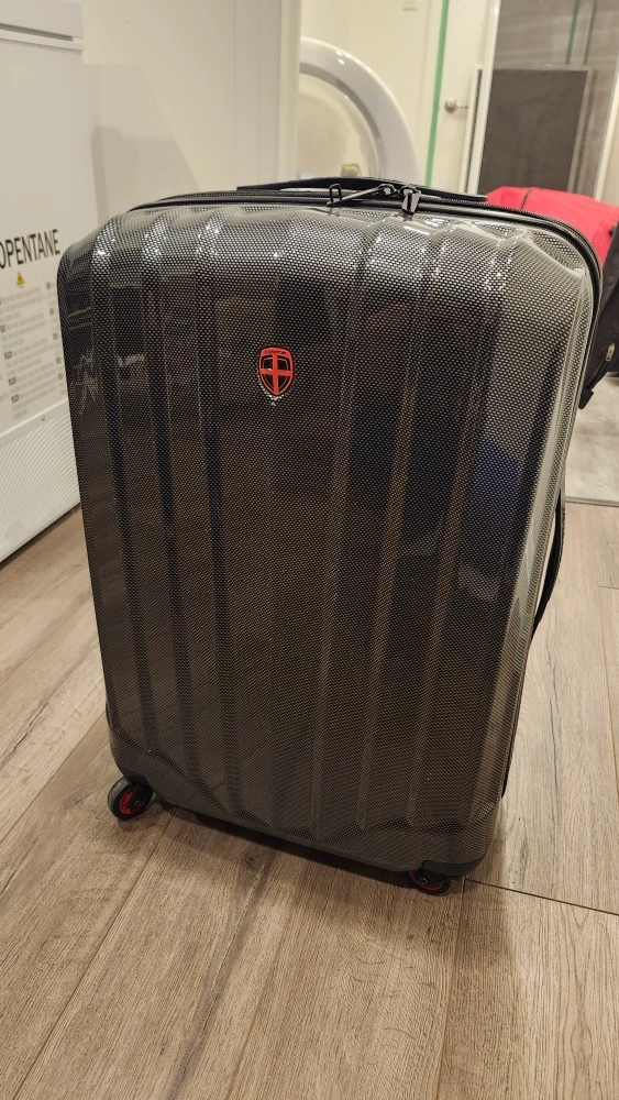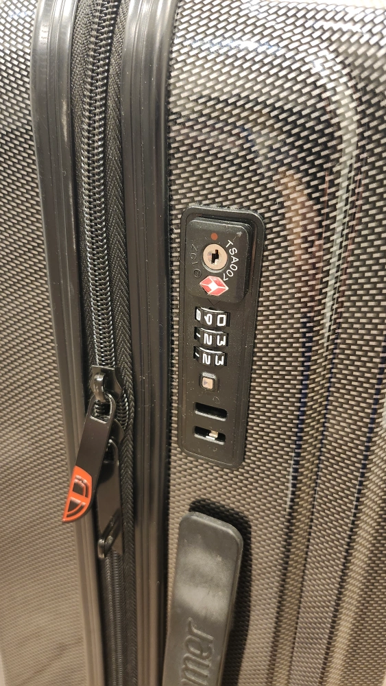 Hard-shell carry-on luggage. Features a retractable handle and spinner wheels. TSA-approved combination lock. Interior includes zippered compartments and cross-straps.