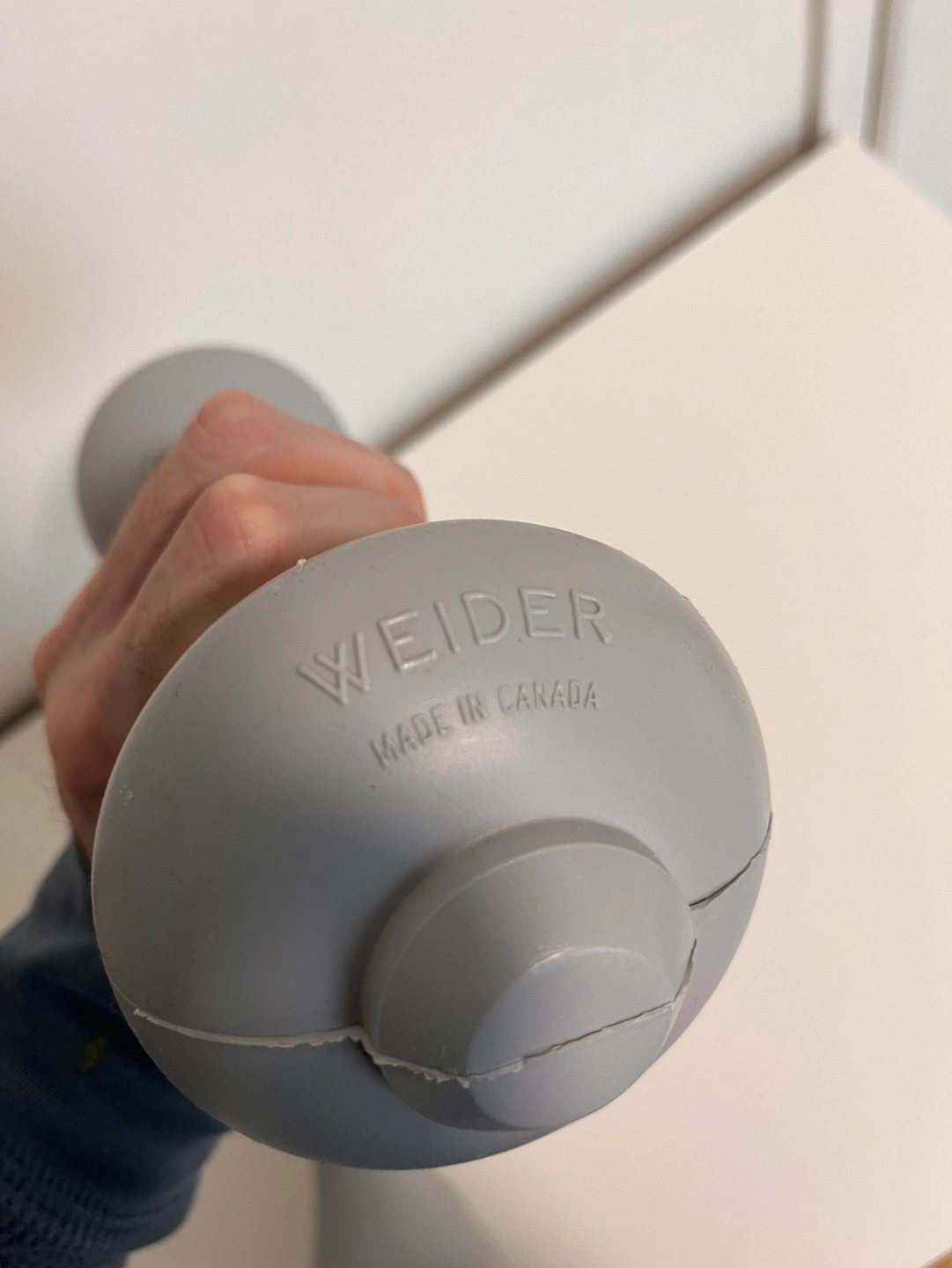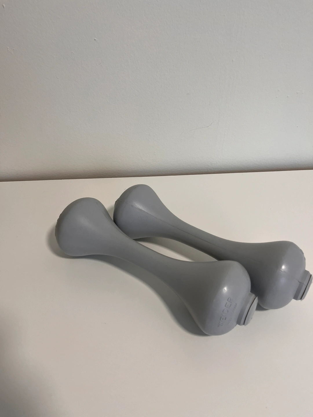 Pair of grey Weider dumbbells. Made in Canada. Good for light workouts and seniors for maintaining muscle and bone density.