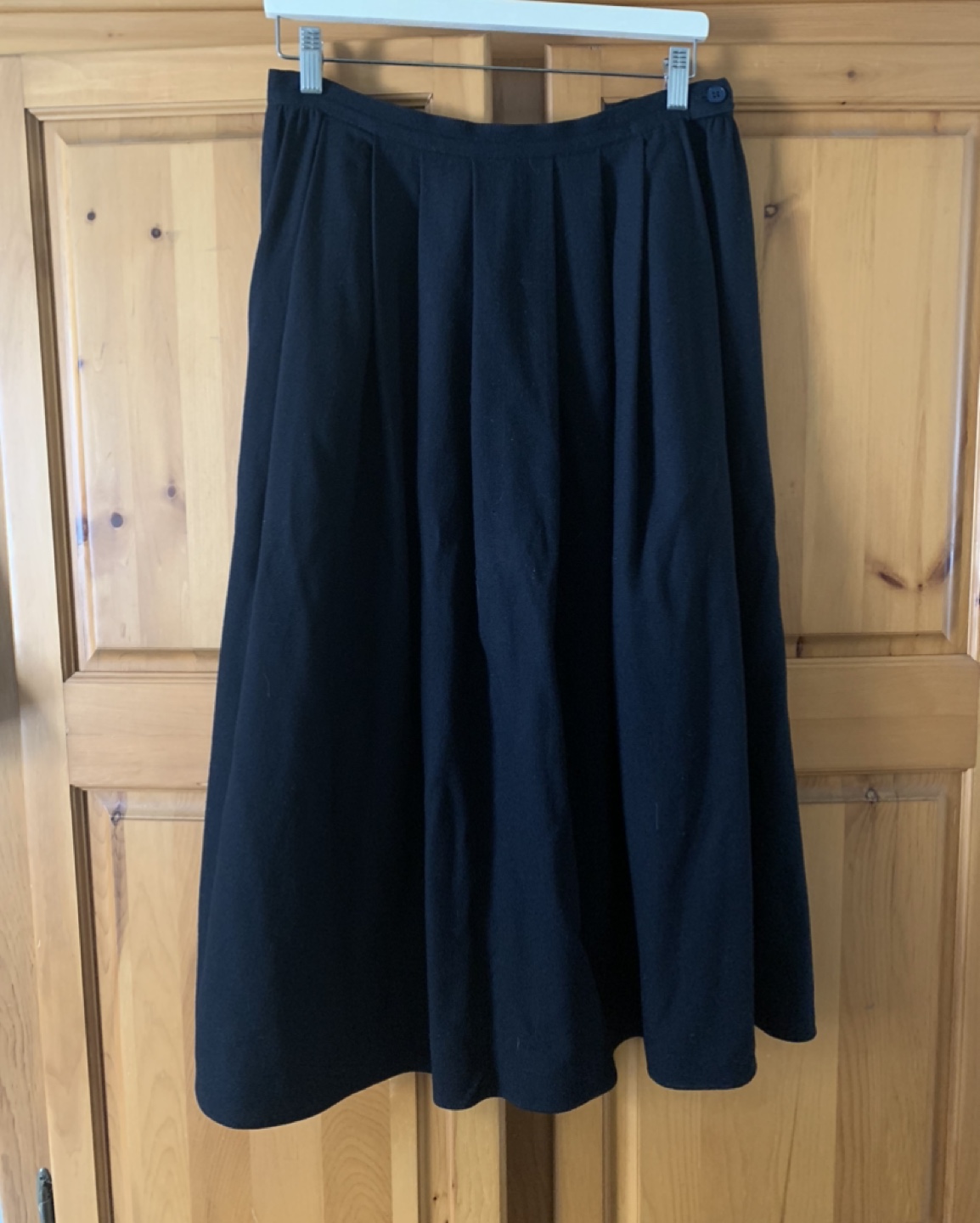 Long black a-line wool skirt, buttons up on the side, excellent condition, super cozy in winter over a pair of wool tights or leggings, flat waist measurement is about 15 inches so should fit around a 30 inch waist
