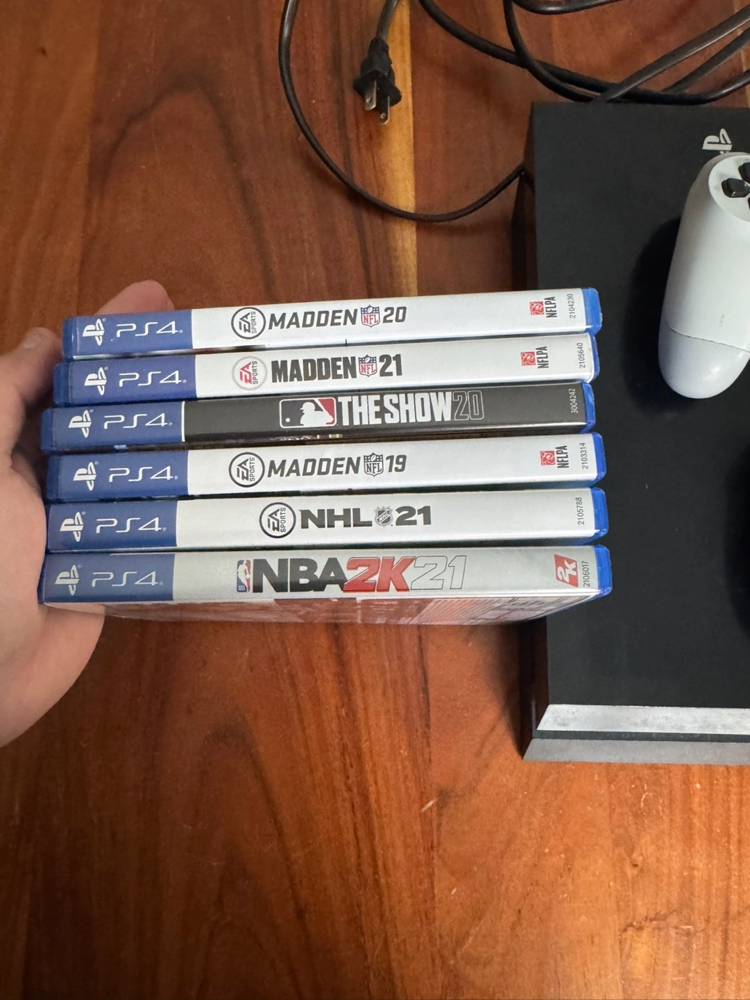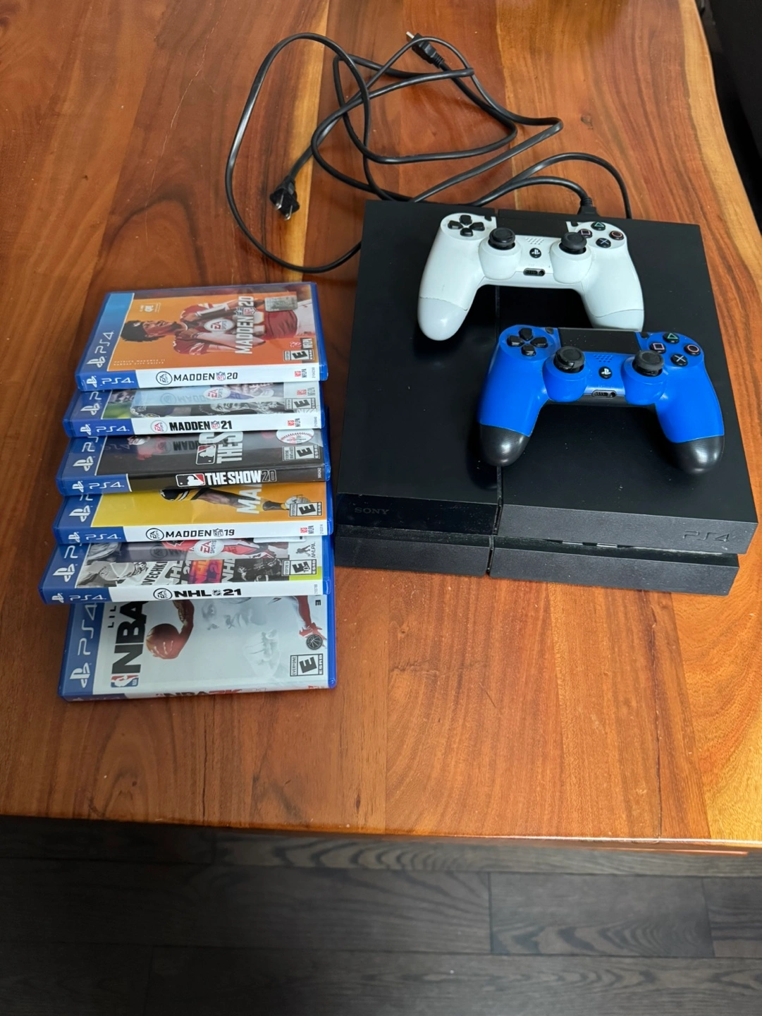 Sony PlayStation 4 console. Includes two controllers, one white and one blue. Six games: Madden NFL 20, Madden NFL 21, MLB The Show 20, Madden NFL 19, NHL 21, and NBA 2K21. Power cord included.