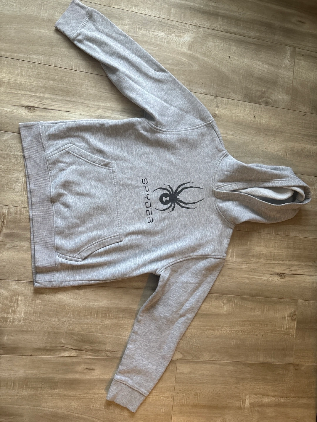 187Youth-sized gray Spyder hoodie. Long sleeves, kangaroo pocket, and a hood. Simple design.
