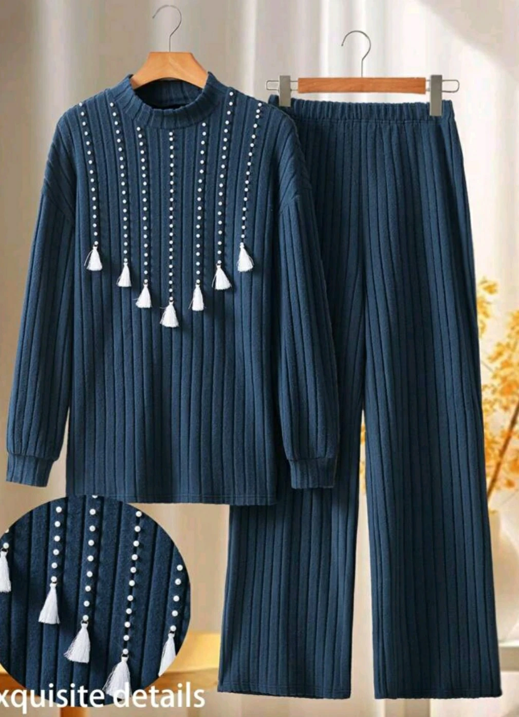 Cozy two-piece loungewear set. Features a ribbed knit top and wide-leg pants. Top decorated with pearls and tassels. Relaxed fit, perfect for lounging.