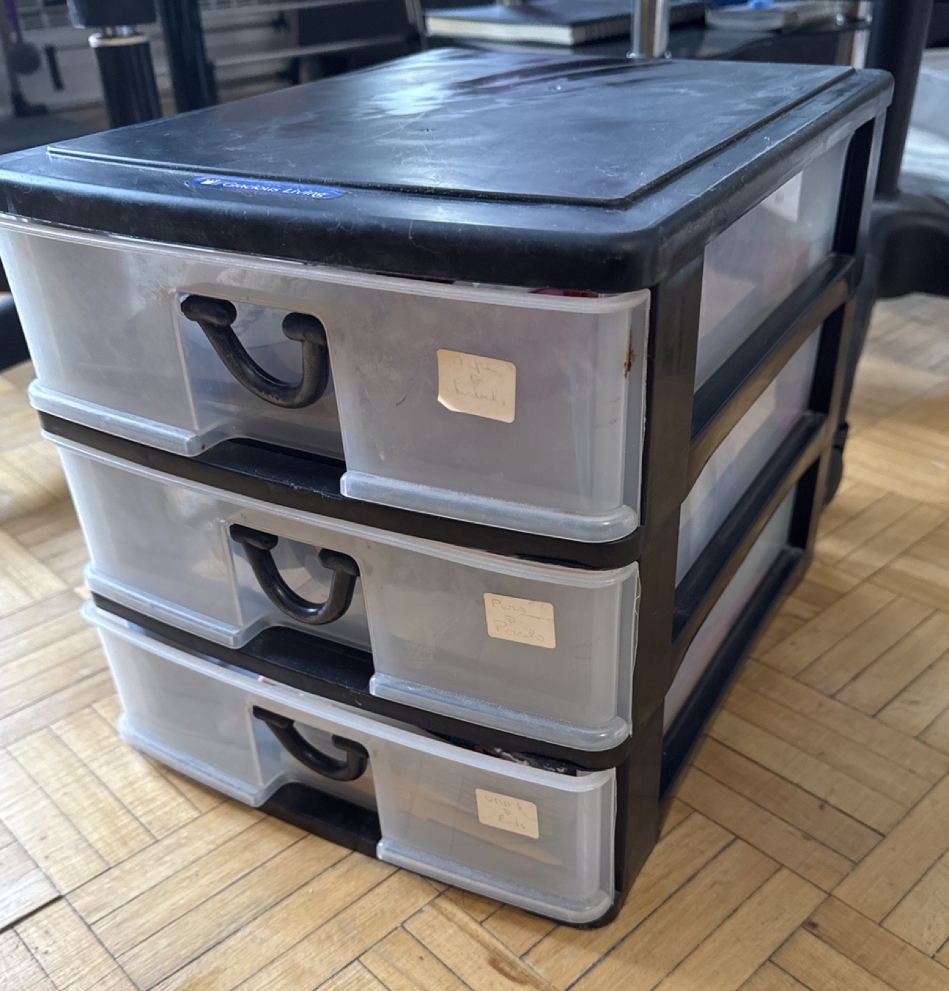 Three-drawer plastic storage unit. Black frame, clear drawers. Small, stackable design. Ideal for organizing small items.