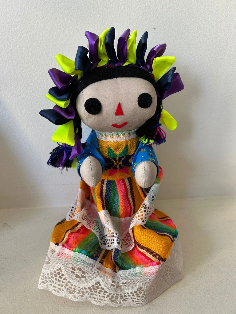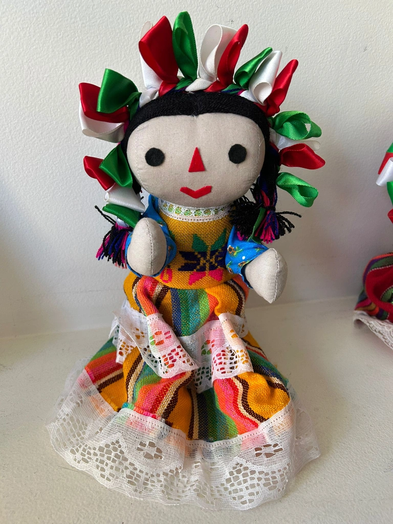 Two handmade Mexican rag dolls. Colorful clothing and ribbon hair. Great for collectors or home décor. Unique and charming.