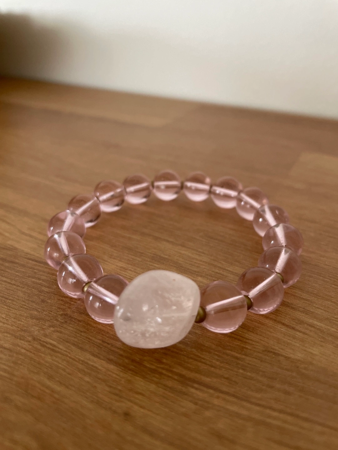 Beautiful bracelet featuring pale pink glass beads and a unique rose quartz focal bead. Gold-toned metal accents between beads. Stretchy design for easy wear. Perfect condition.