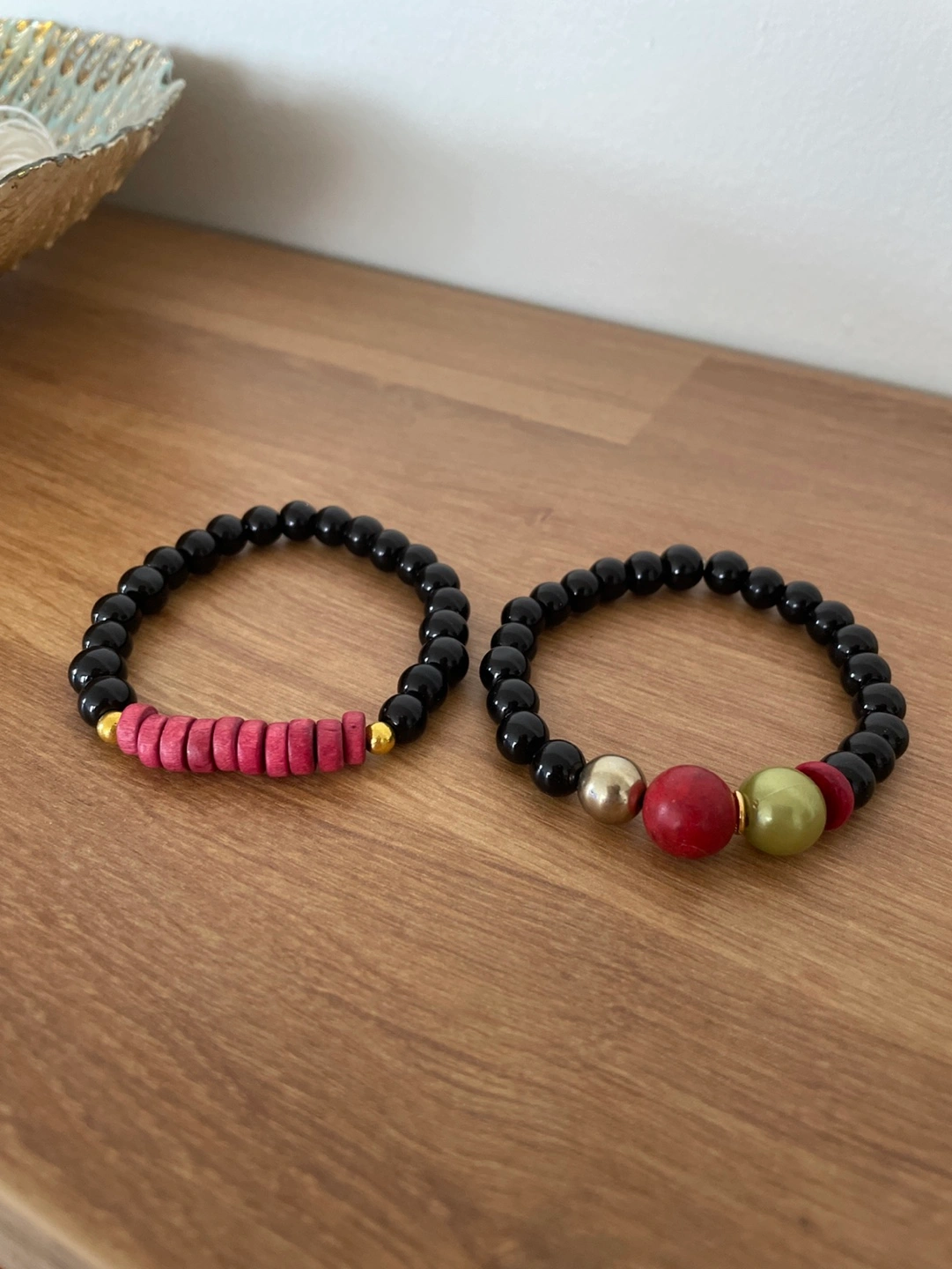 Set of two bracelets. Black beads with colourful accents. One features pink wooden beads, the other has red, gold and green beads. Stretchy beaded bracelets. New, never worn.