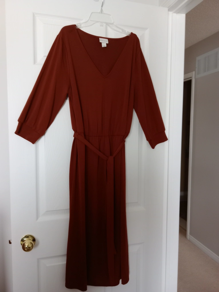 Beautiful rust-coloured midi dress. Features a V-neck, three-quarter sleeves, and a tie waist. Made from a soft, comfortable modal and polyester blend. Excellent condition.