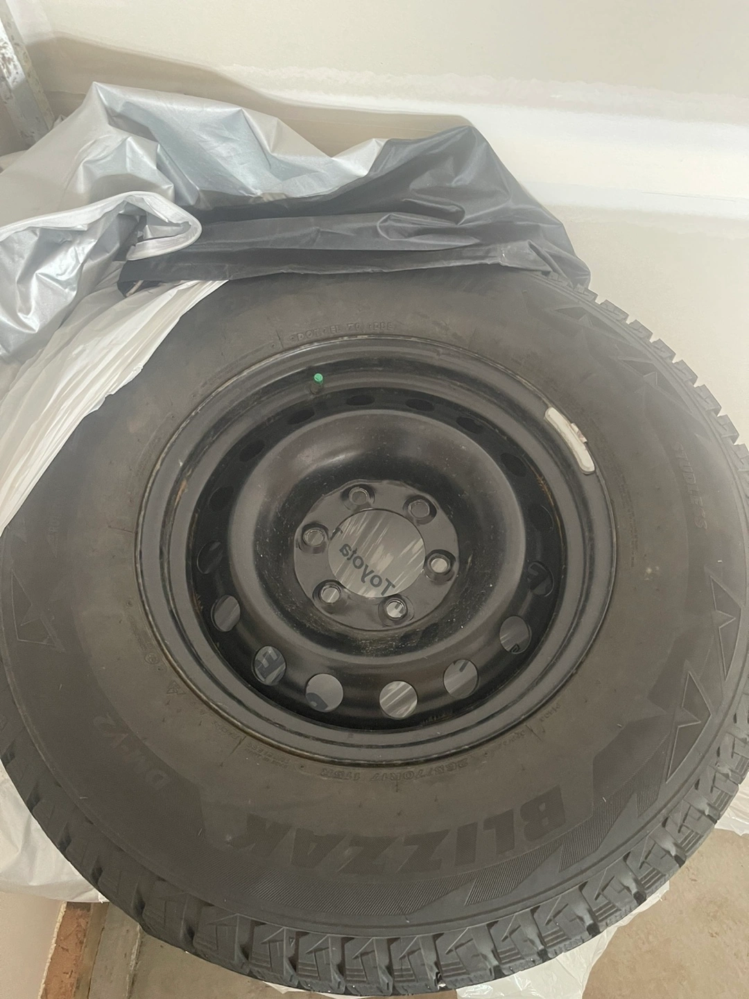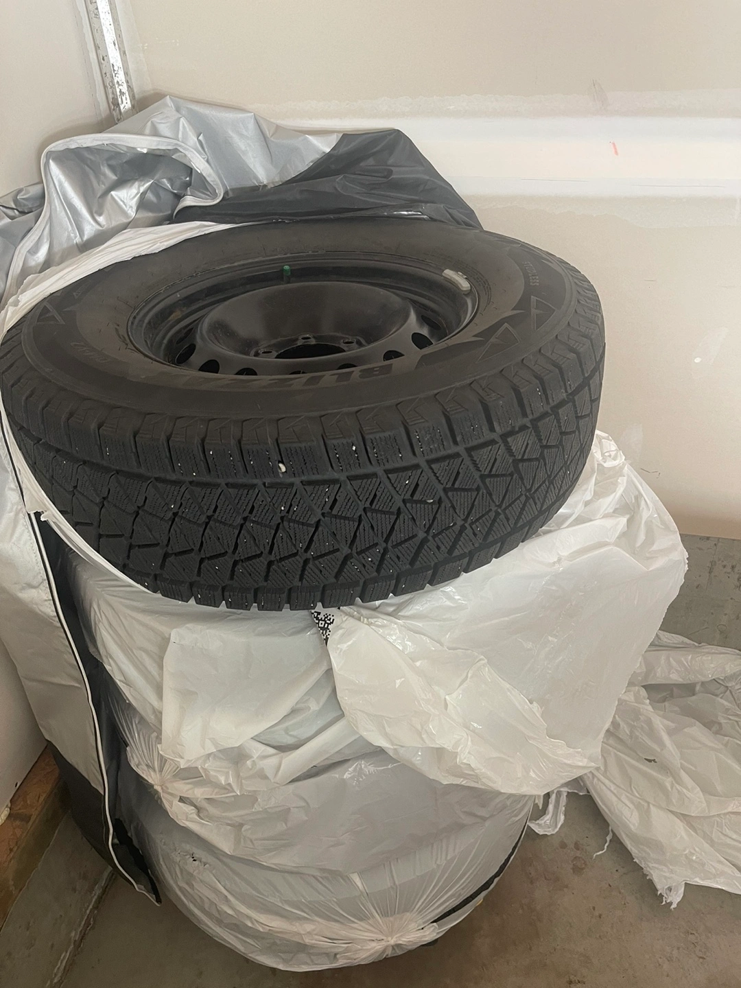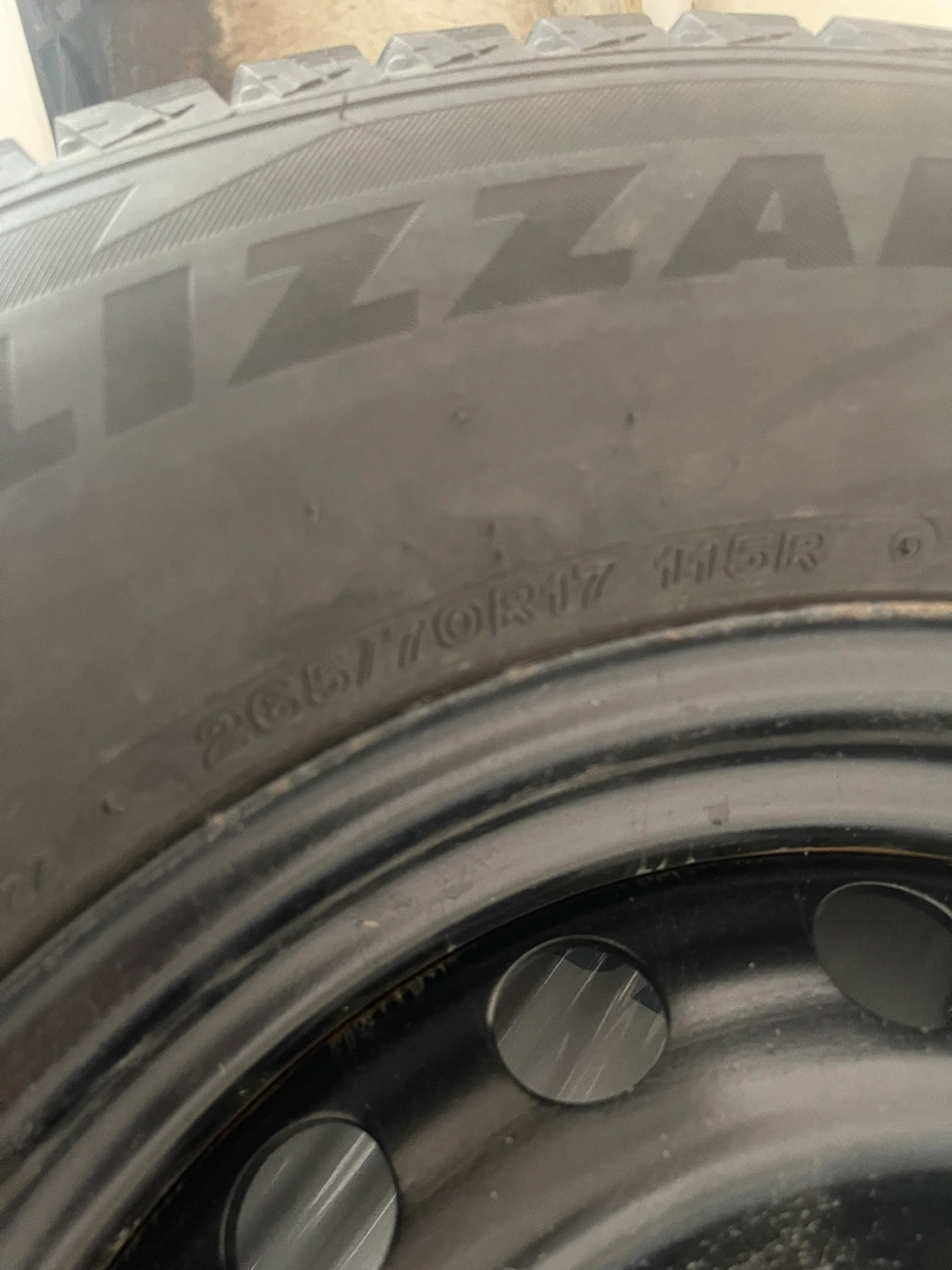 Set of used Blizzak winter tires mounted on rims. Good tread depth. Size 265/70R17 115R. Black steel rims. Sold as a set. Originally priced at 1600