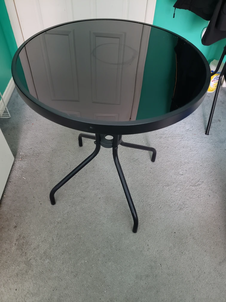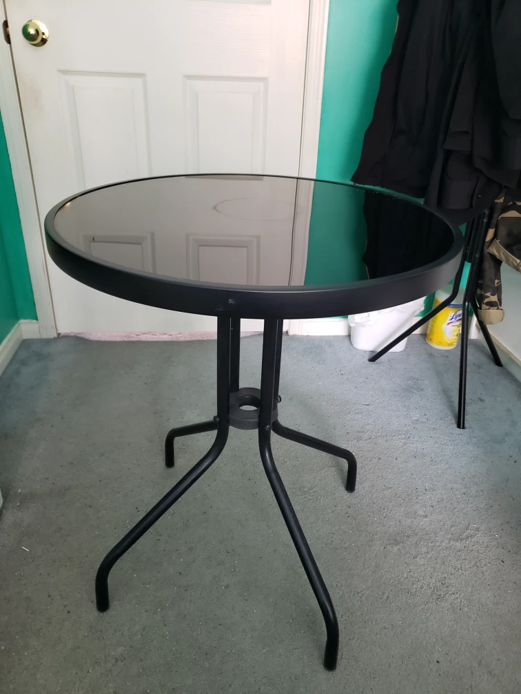 Small round patio table. Black metal frame. Black glass top. Good condition.