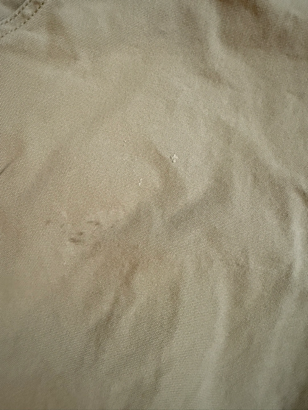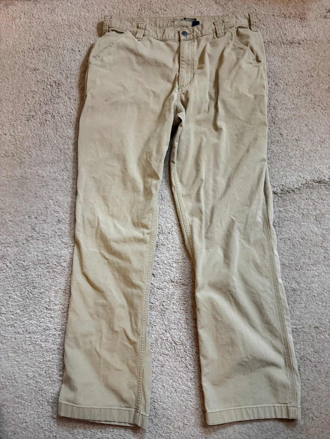 Men's khaki work pants. Multiple pockets. Straight leg. Good used condition. Some minor stains.