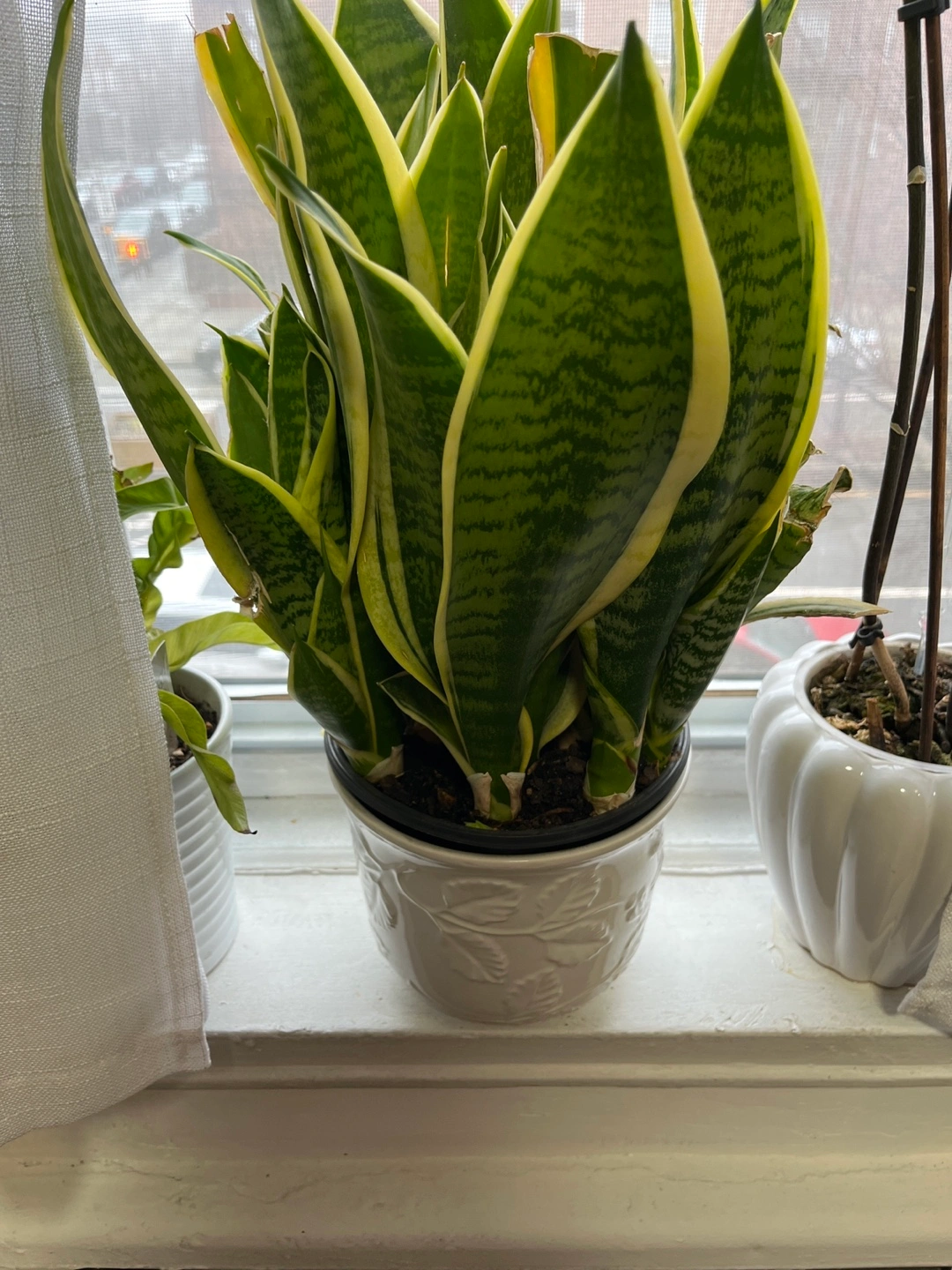 Healthy snake plant in a decorative white ceramic pot. Great addition to any home. Plant is potted and ready to go.