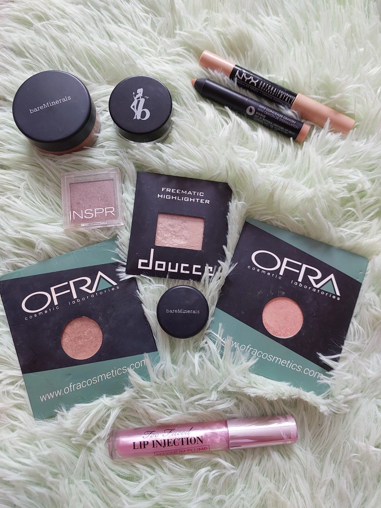 Variety of makeup including eyeshadows, highlighters, blush, and lip gloss. Includes brands like OFRA, bareMinerals, Too Faced, and NYX. Perfect for experimenting with different looks.