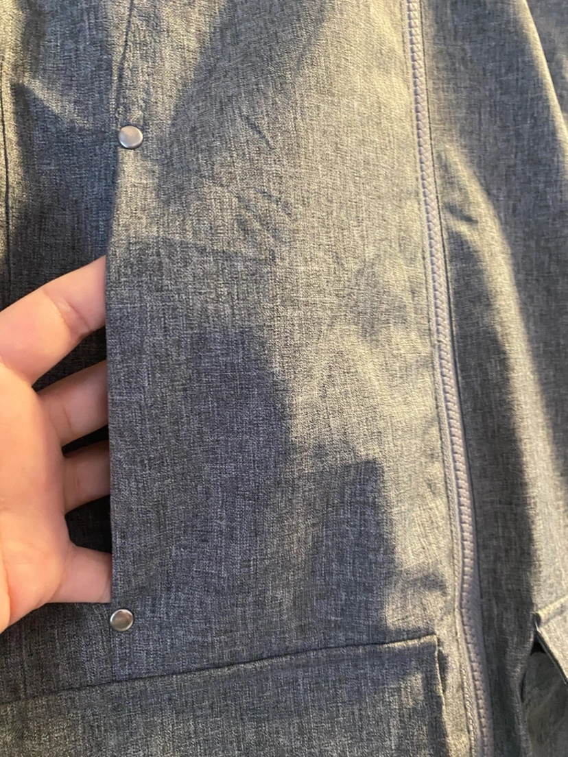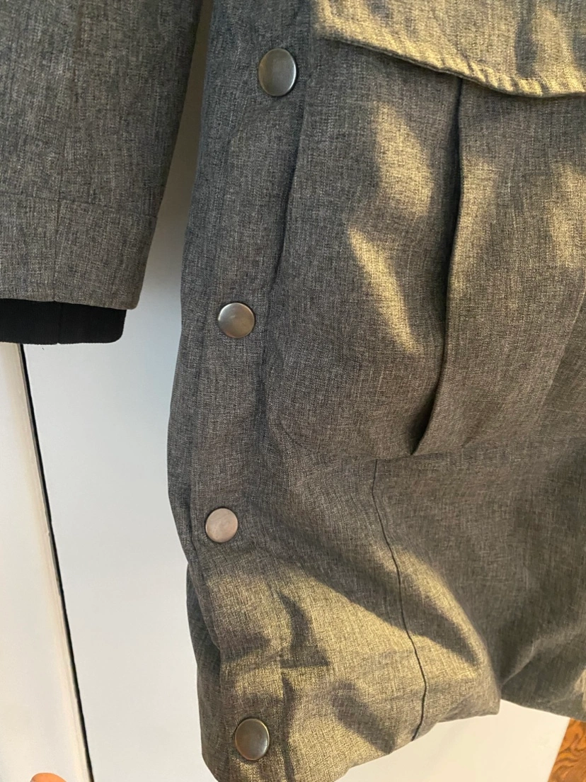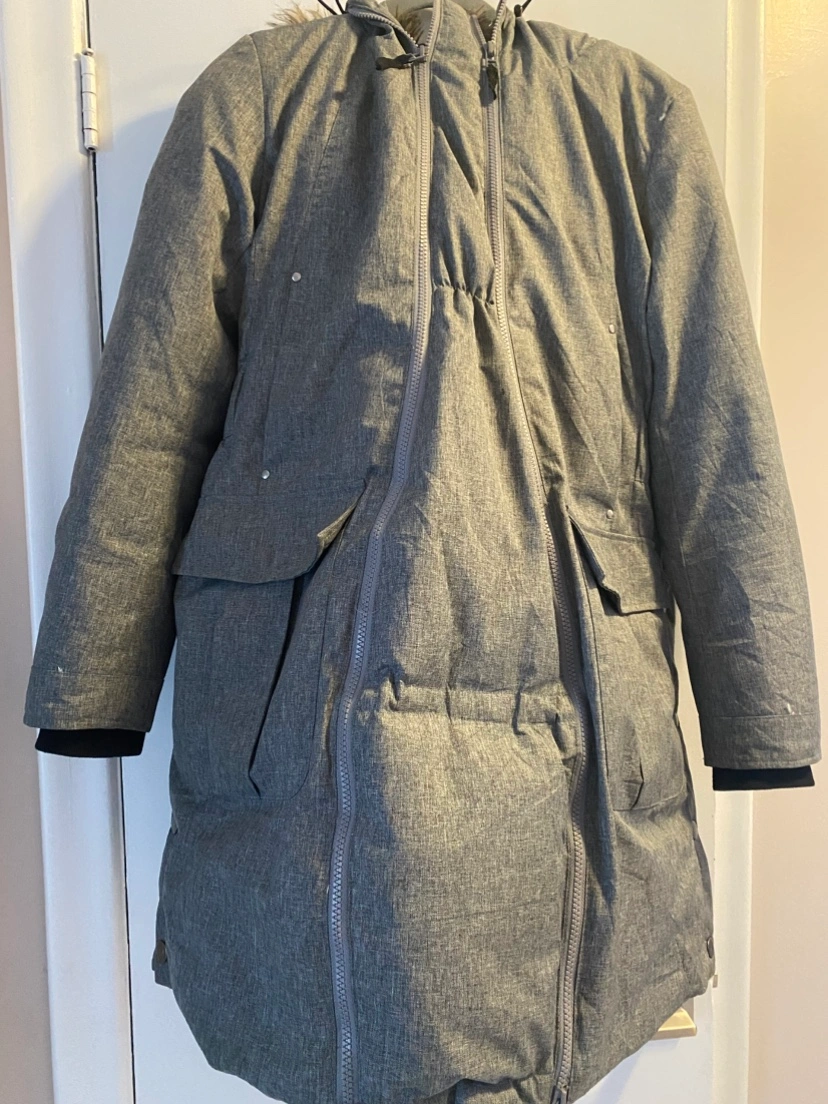 Mid-length grey winter parka from Thyme Maternity with removable center insert so that it can be used postpartum as well. It is down filled. Features a faux fur trimmed hood, side snaps, multiple pockets that are lined and deep, and an elastic waist. Zipper and snap closure. Great for cold weather. Size is an XS but fits more like a small. Please refer to pictures for details and condition.
