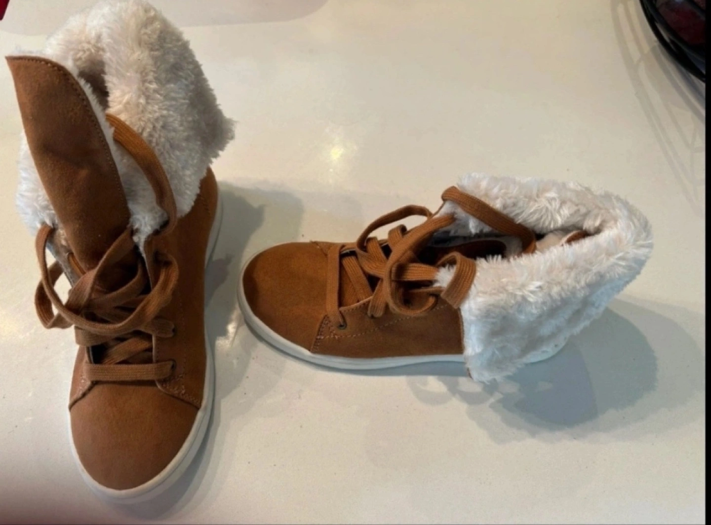 Pair of brown high-top sneakers. Fuzzy lining. Lace-up closure. Great for fall and winter. Size 2.5