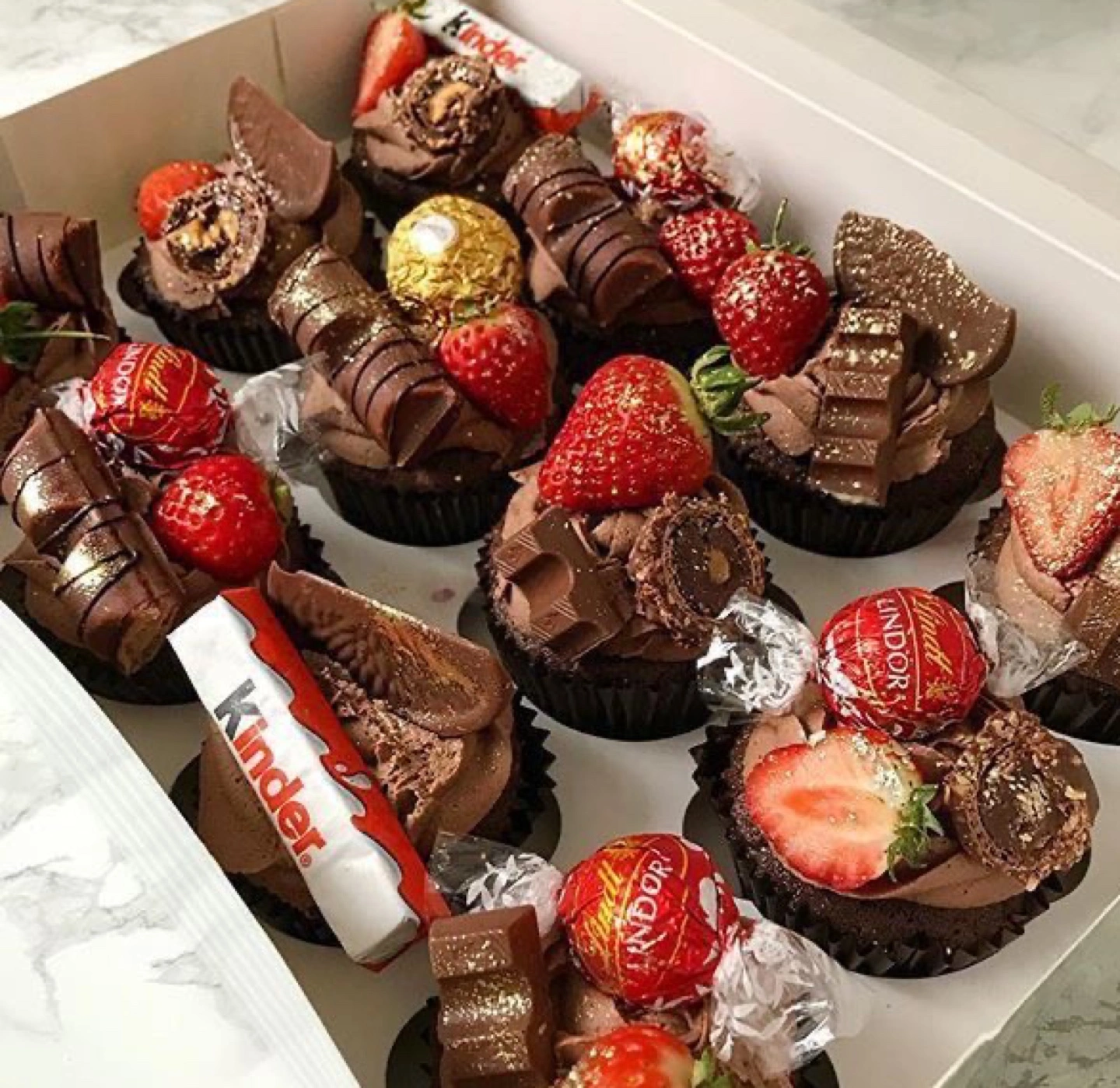 Chocolate cupcakes with chocolate buttercream, kinder, lindt, strawberries, Ferrero Rocher and gold dust as topping. 80$ for 12 pcs. Perfect to impress at special events! MADE FRESH