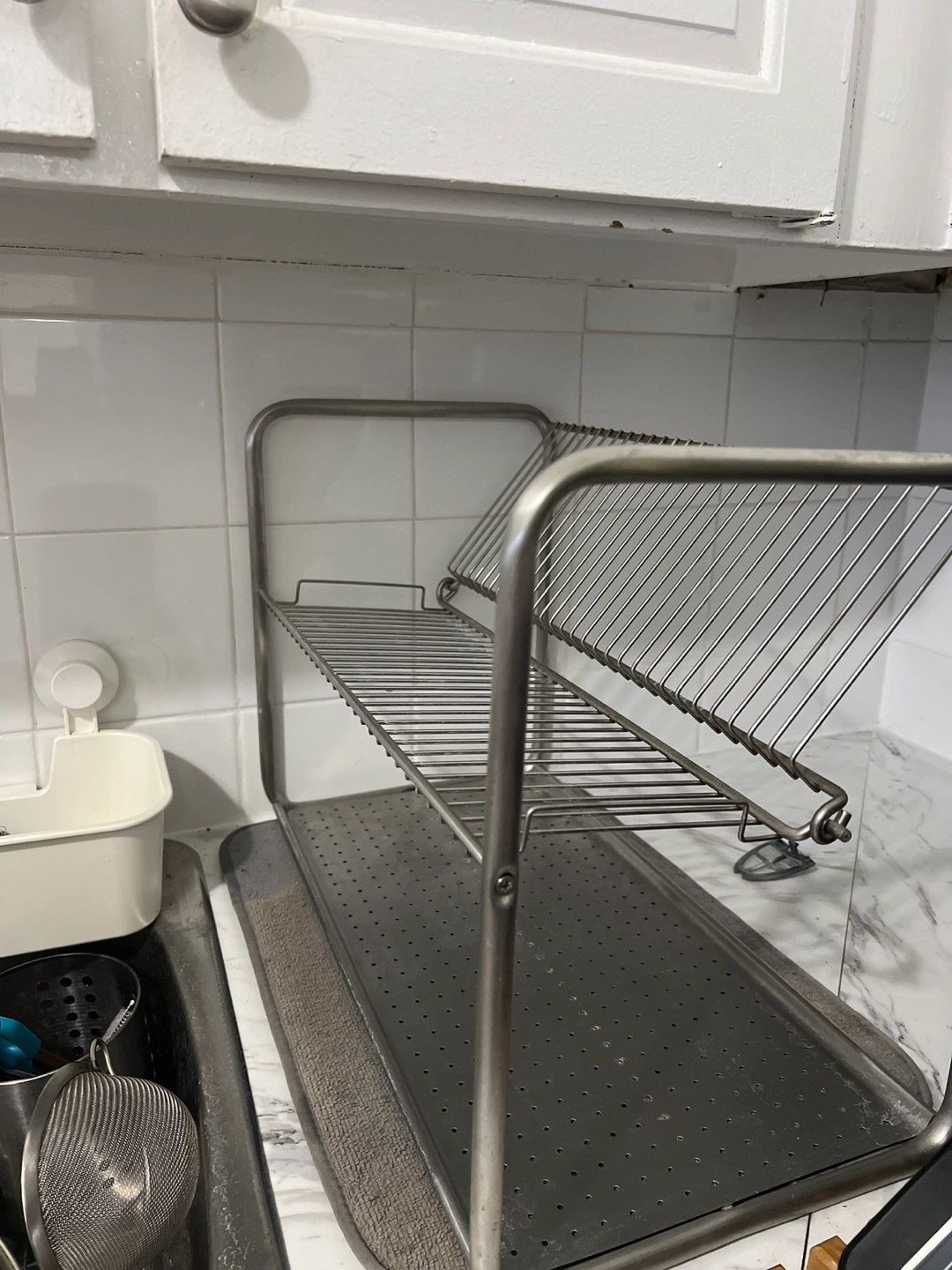 Stainless steel dish rack. Two tiers for plates and cutlery. Includes a drip washable pad. - 20 CAD