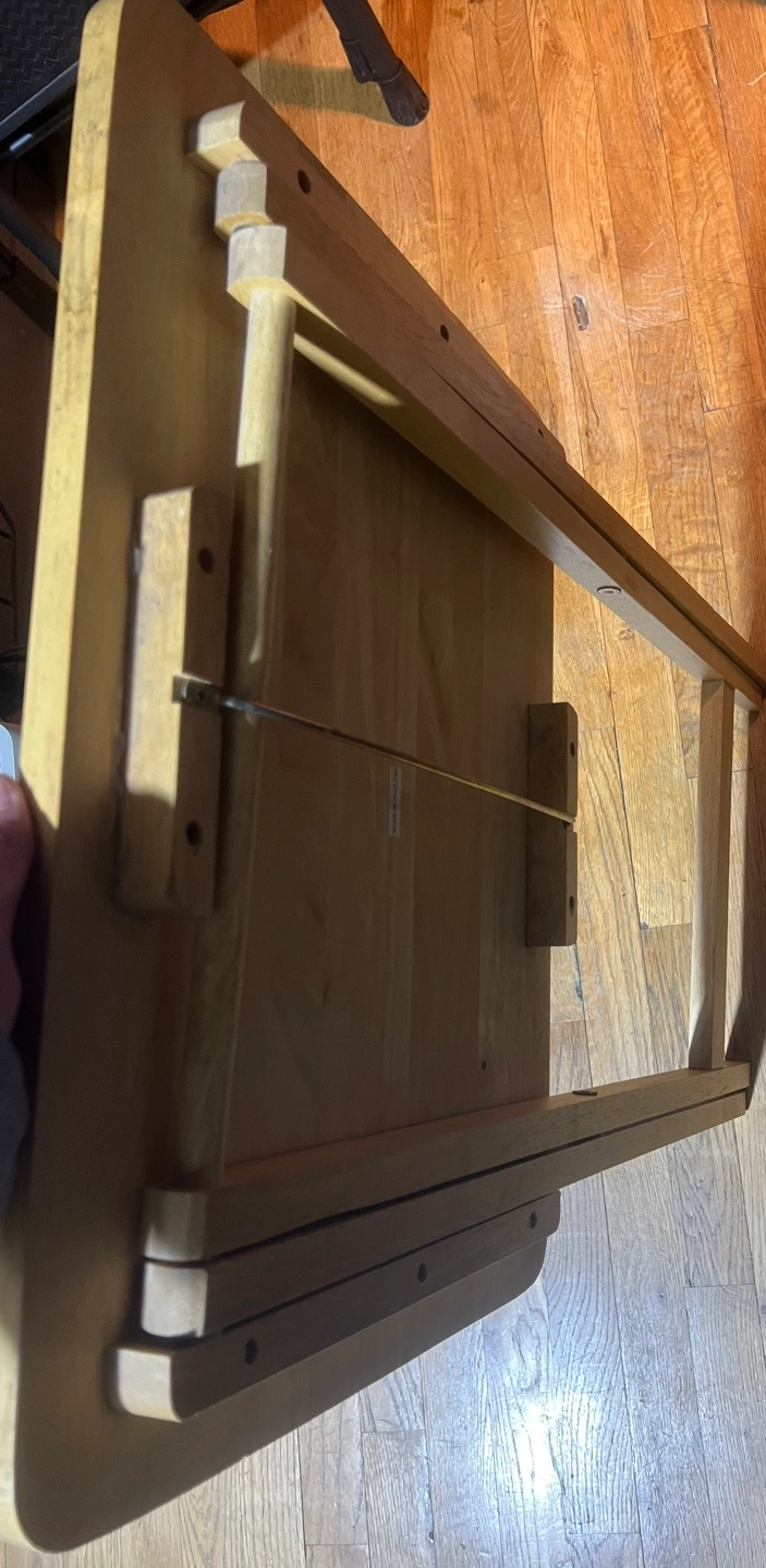 Collapsible wooden table that folds for easy storage. Light wood finish, please see photos. Small and portable, measures approximately 19”L x 14"W x 26"H.