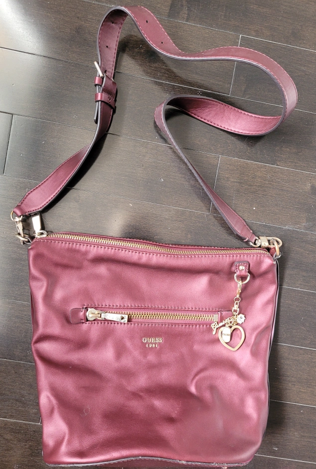 Stylish burgundy Guess crossbody bag. Features a zipper closure, adjustable strap, and interior pockets. Includes a cute charm. Great for everyday use.