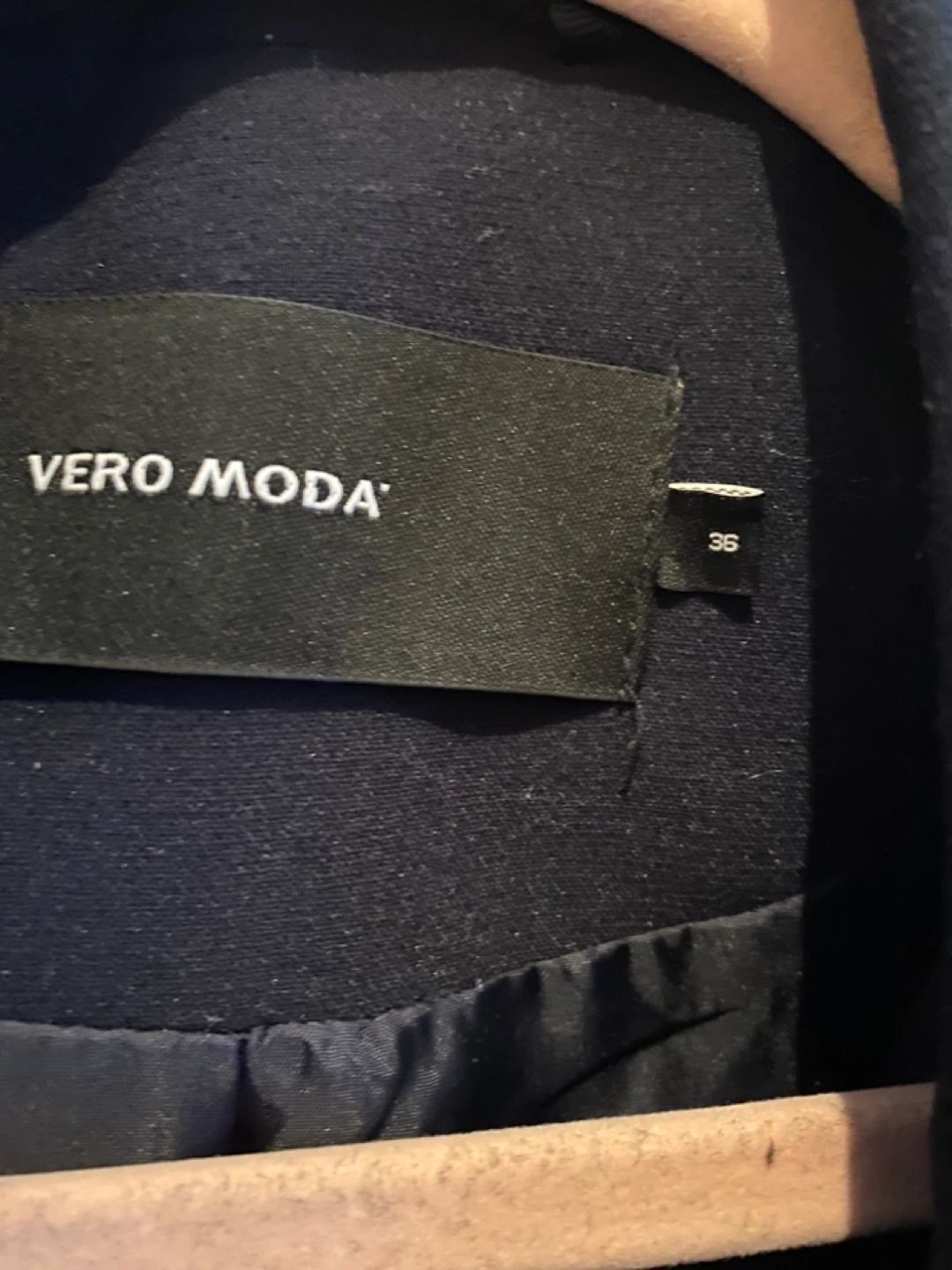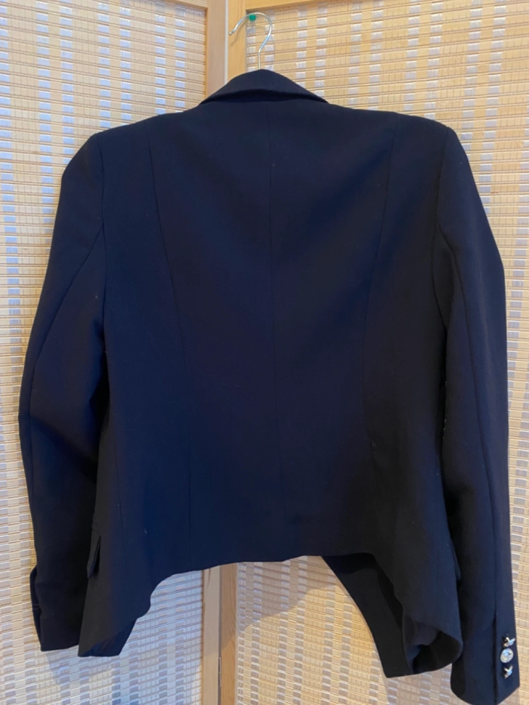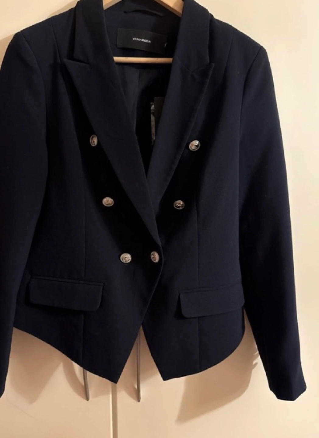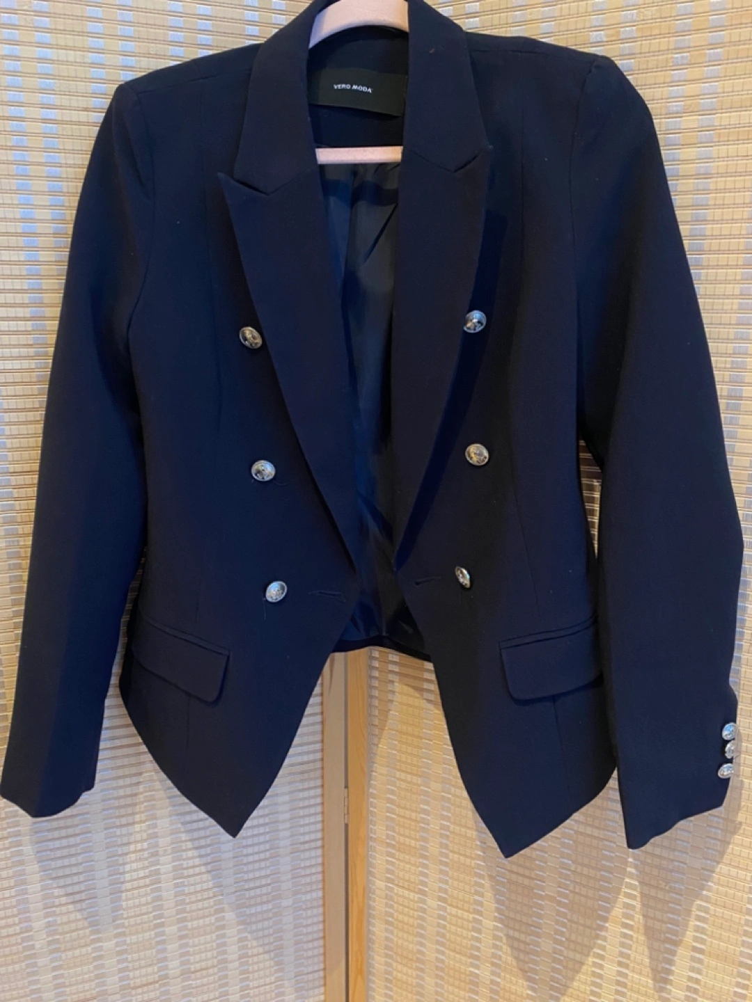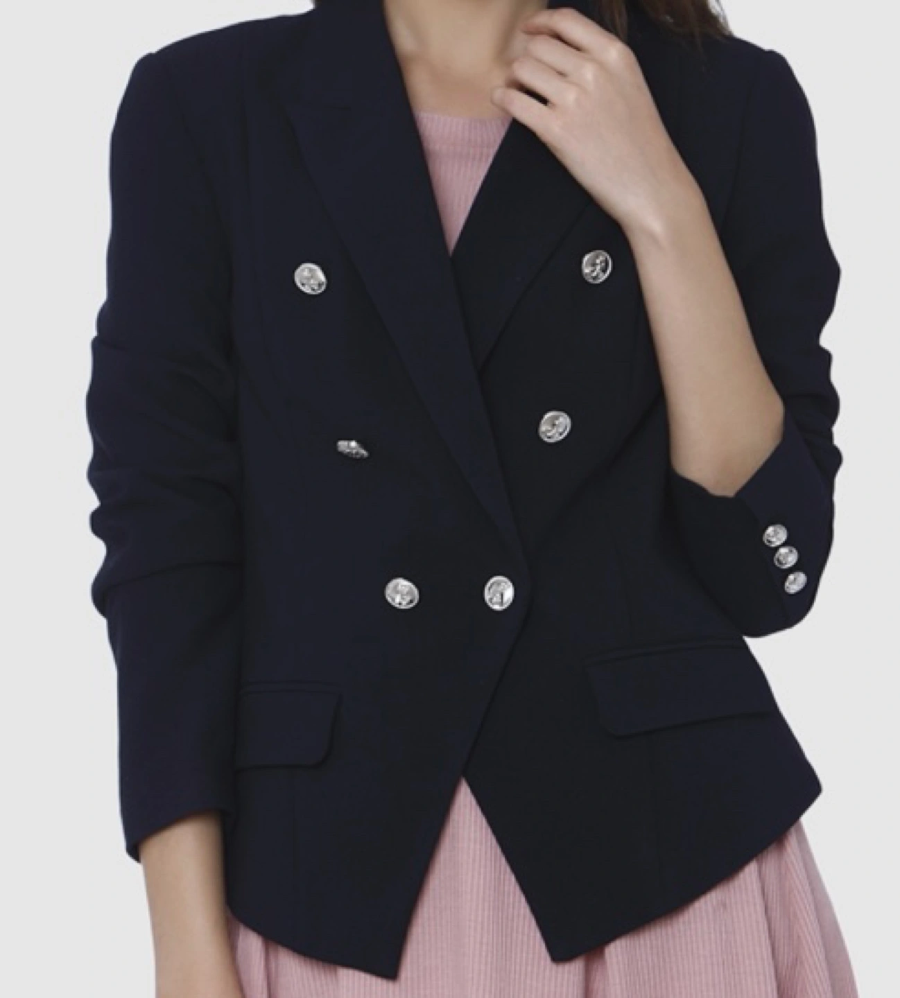 Women's navy blazer. Double-breasted style. Features silver-toned buttons. Cropped length. Long sleeves.
