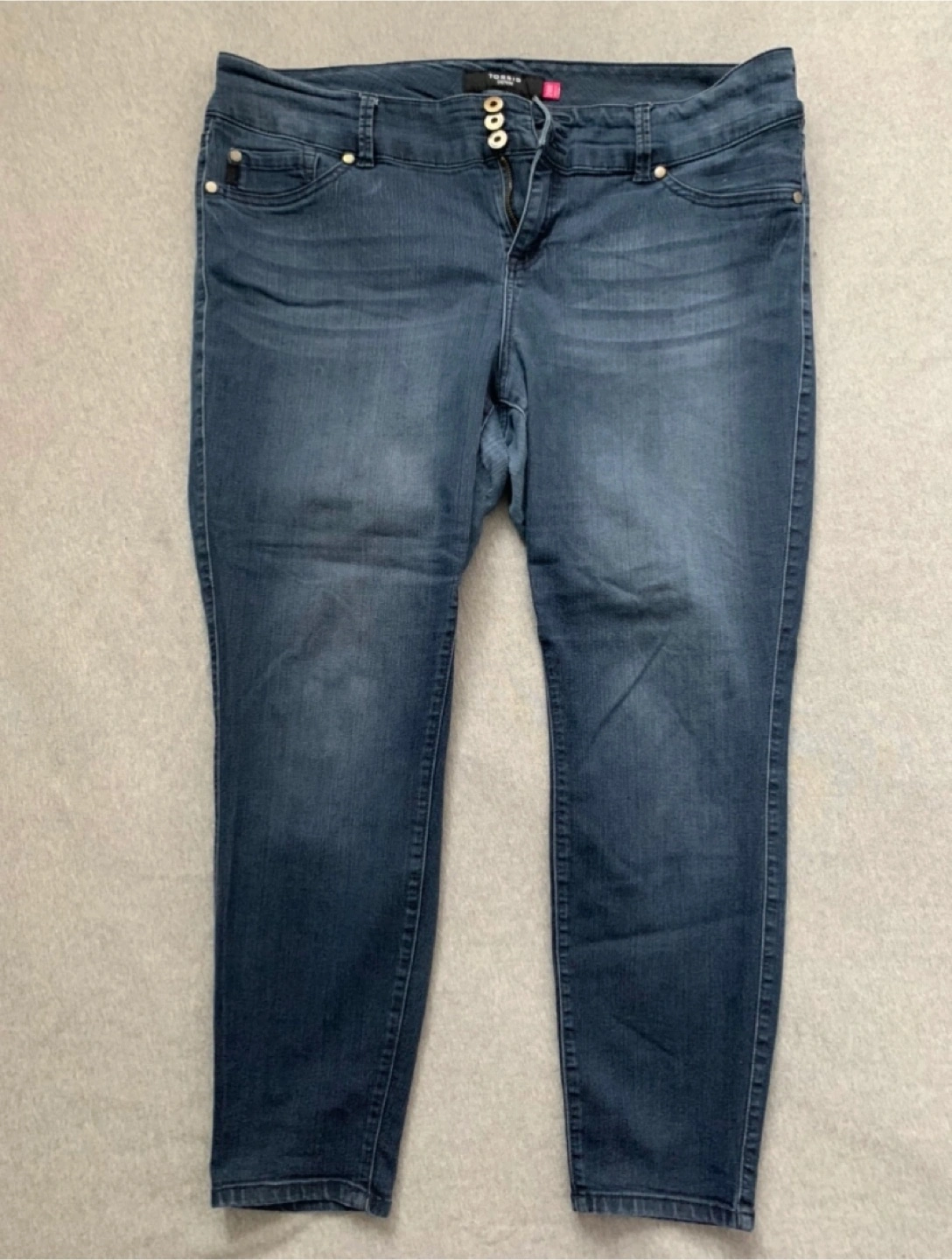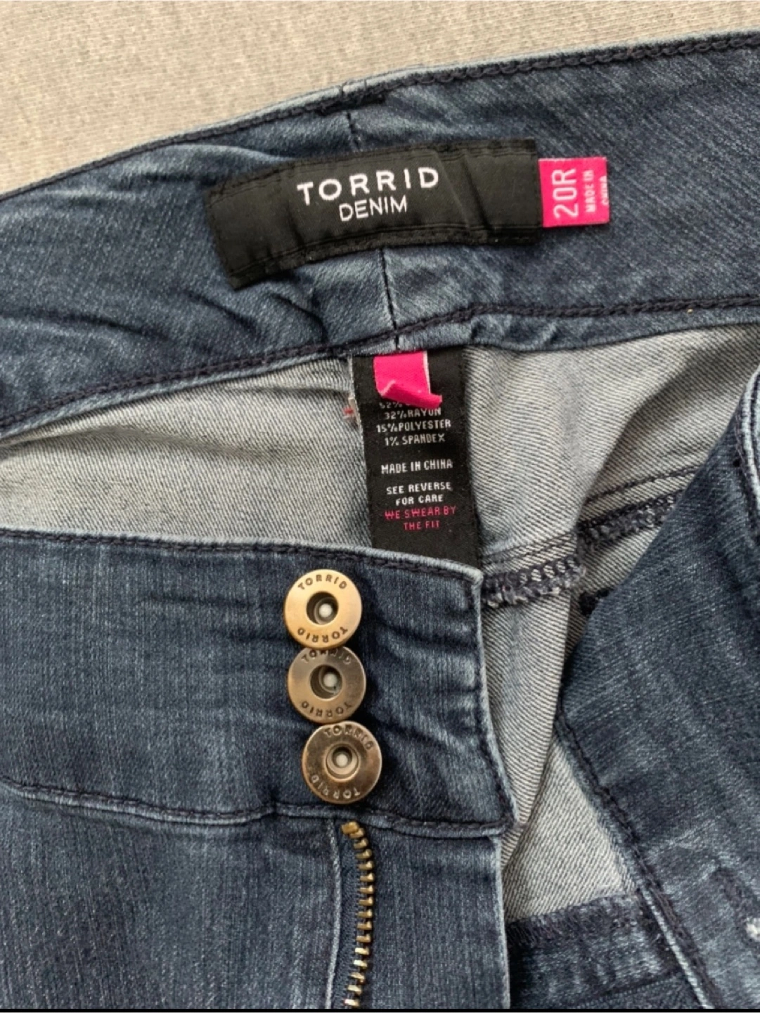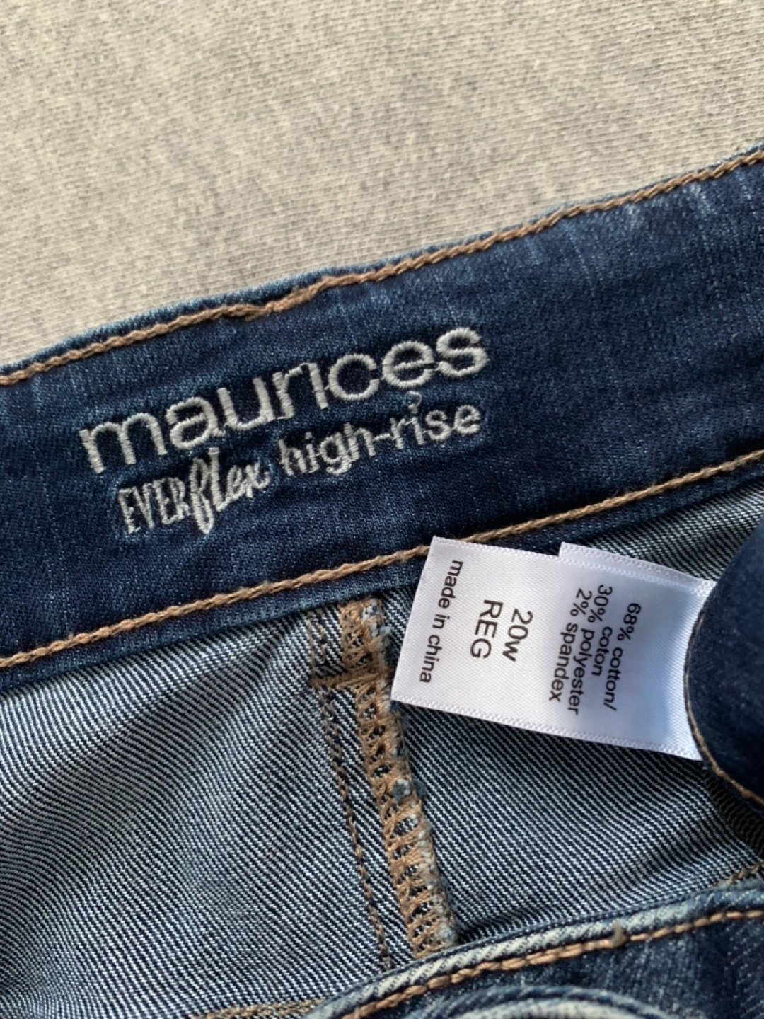 $7 — Maurices Everflex High-Rise Jeans - Women’s Size 20W Women's size 20W Maurices Everflex high-rise jeans. Dark wash denim. Excellent stretch. $3 — Torrid Denim Jeans Size 20R Women's dark wash denim jeans. Size 20R. Three button closure. 97% rayon, 2% polyester, 1% spandex. Note: there is very slight ware beginning to show on inner thigh. Price marked accordingly.
