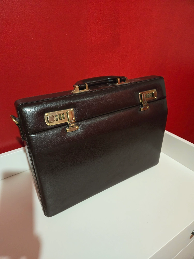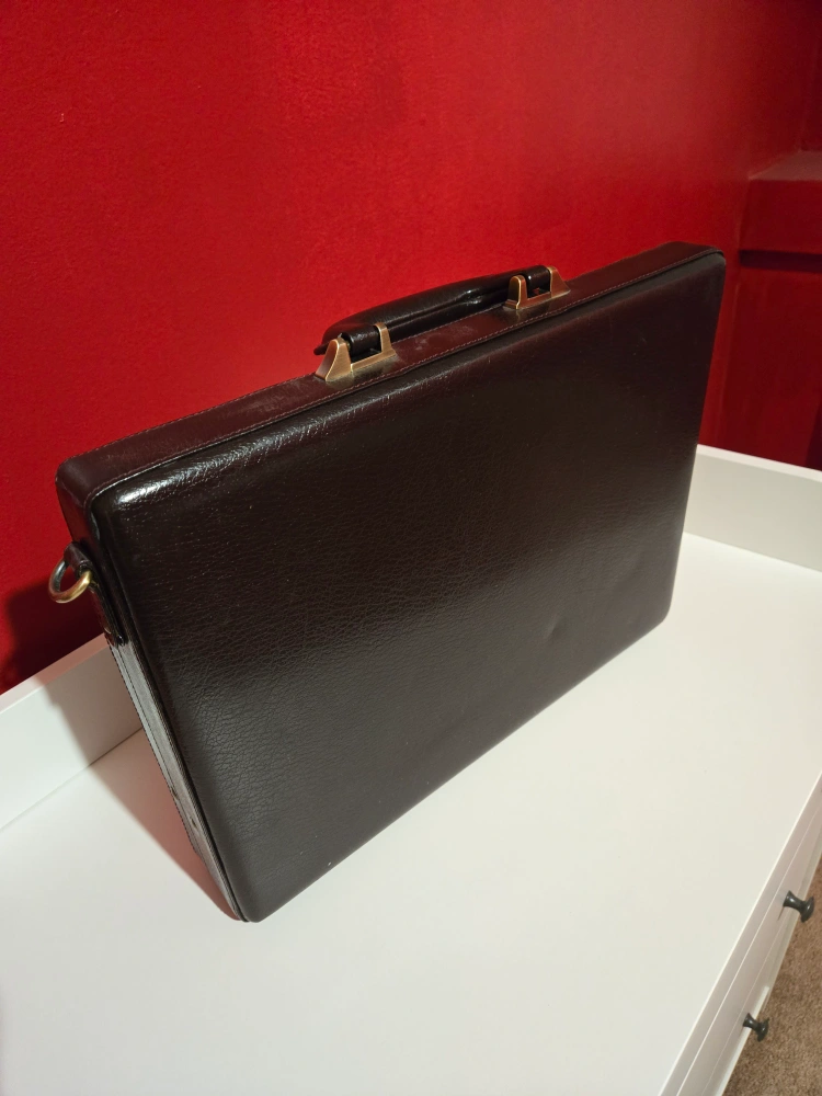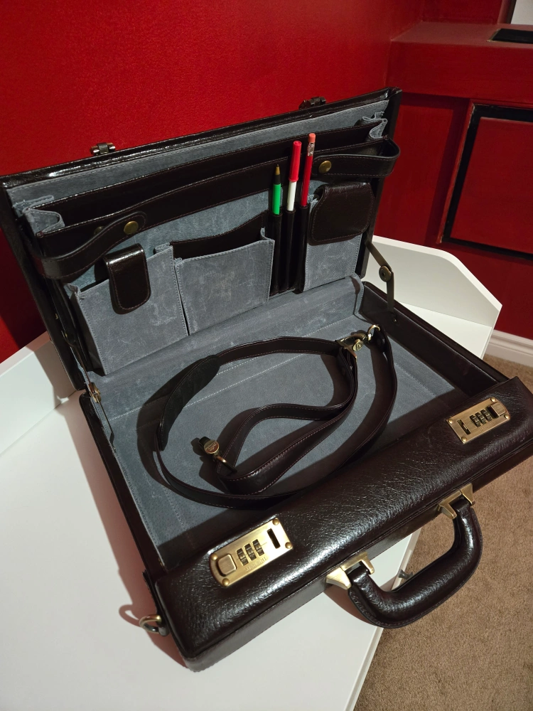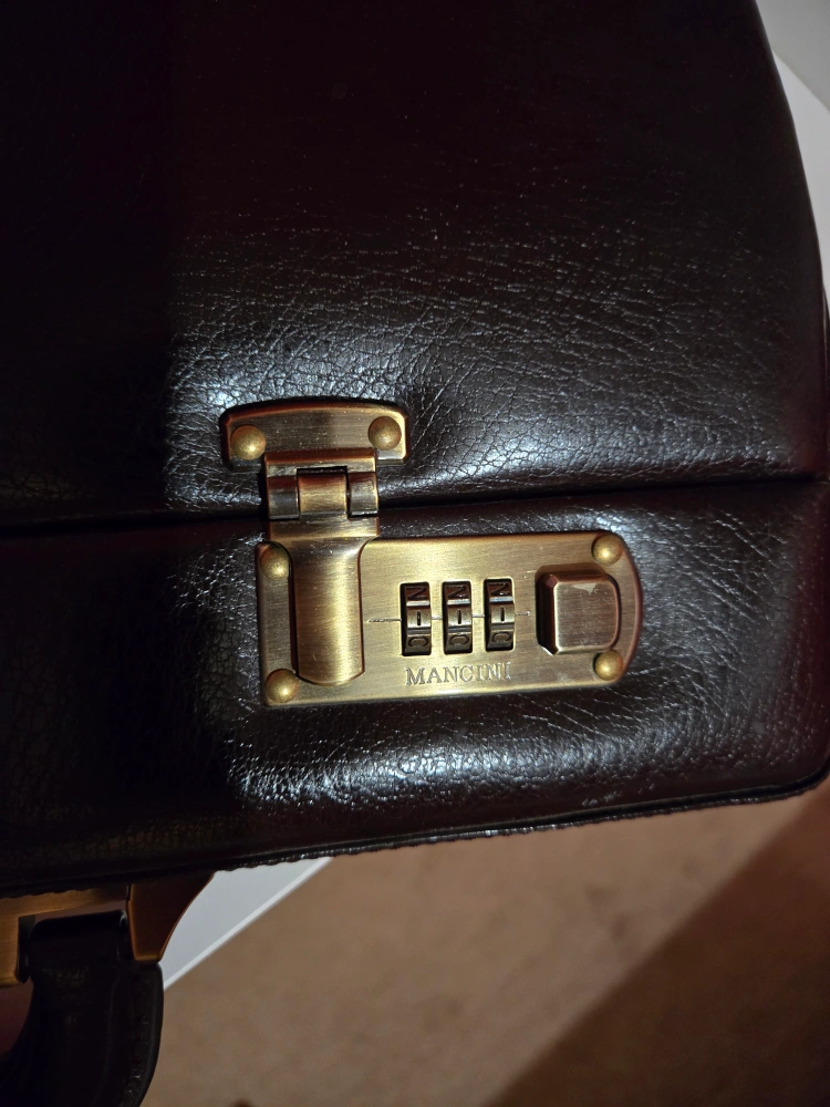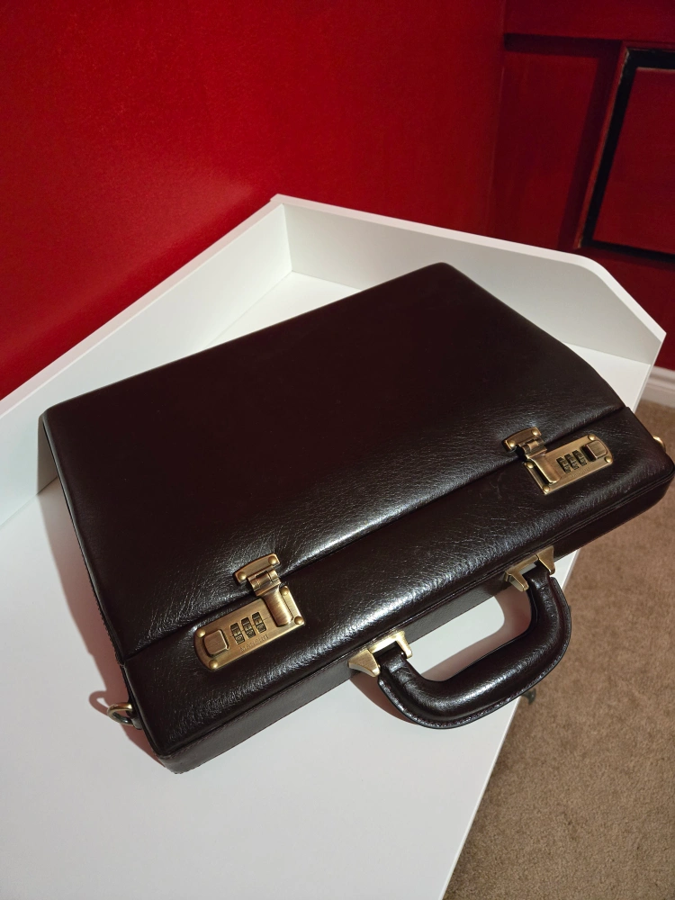 Stunning dark brown leather briefcase. Combination lock, reset to 111 - 111. Easy to set to any combo you choose. Interior pockets and compartments. Adjustable shoulder strap included. Great for work or travel.
