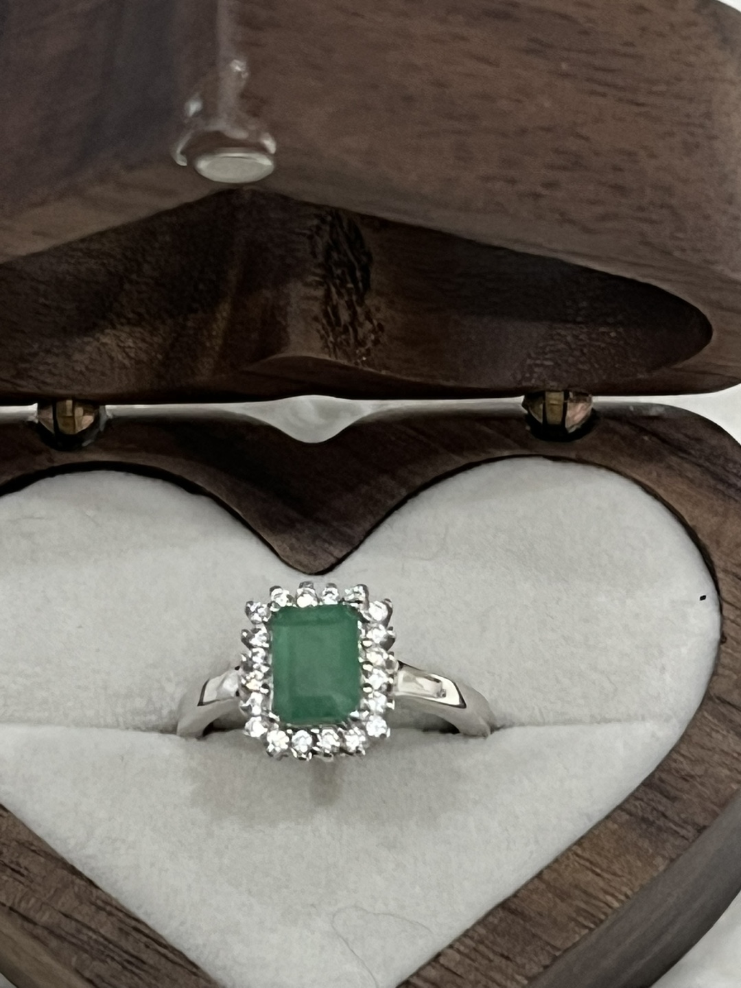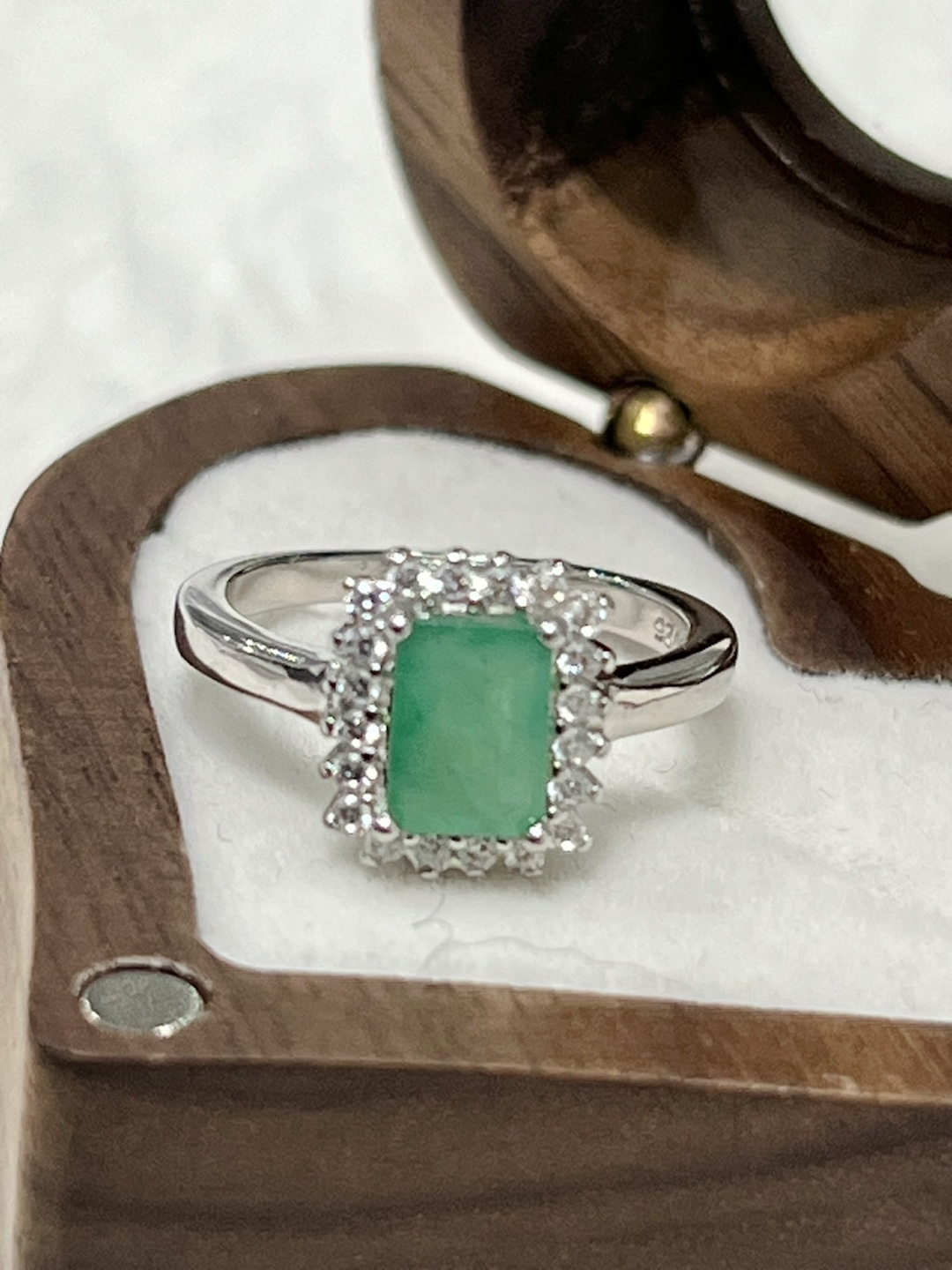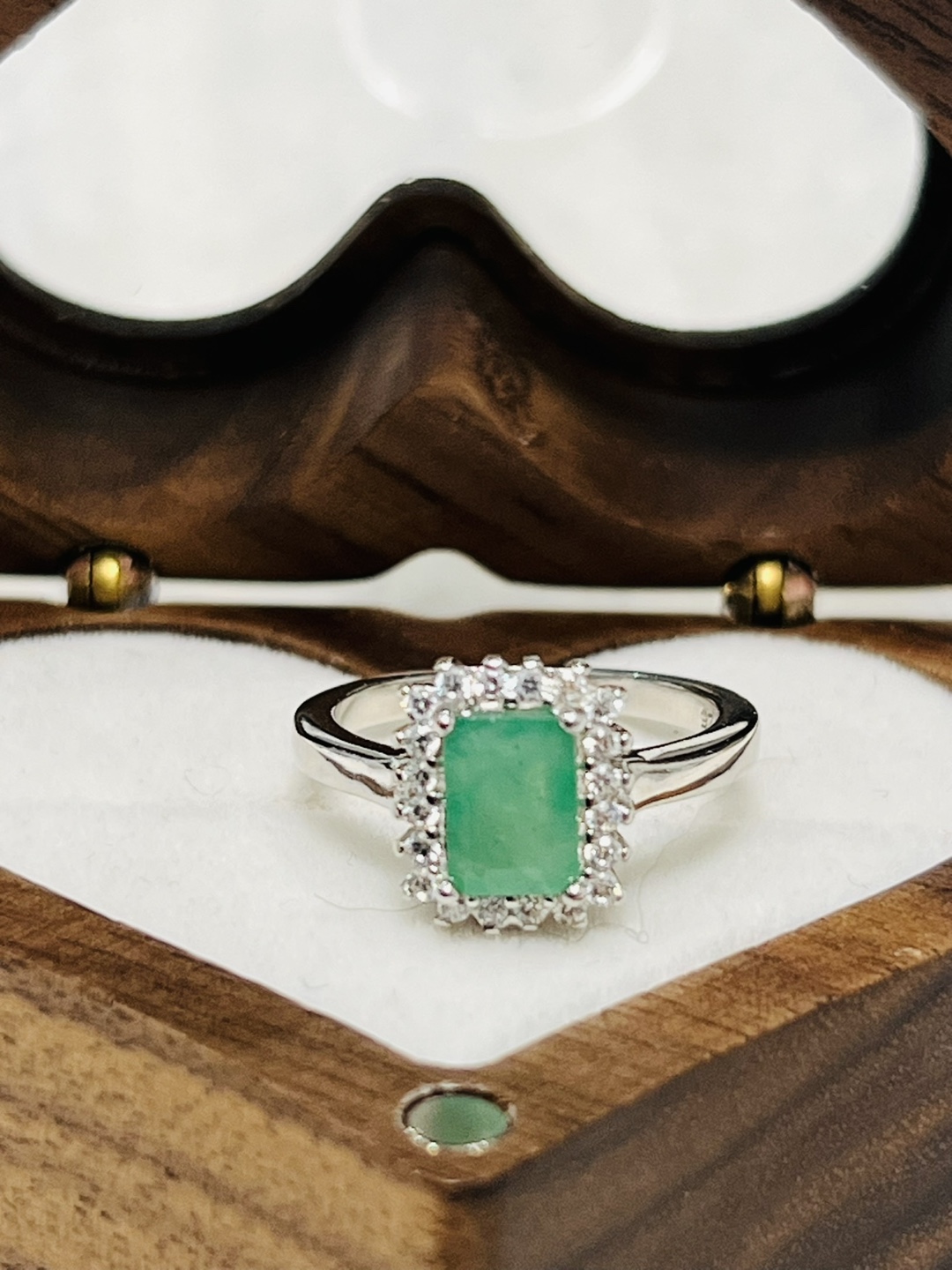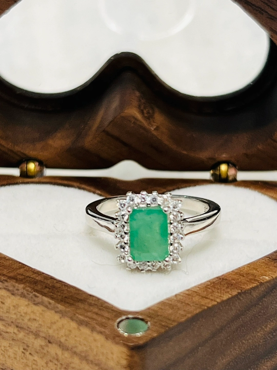 Beautiful ring featuring a rectangular genuine Colombian Unheated emerald gemstone. Surrounded by small cubic zirconia stones. Silver band. Presented in a box