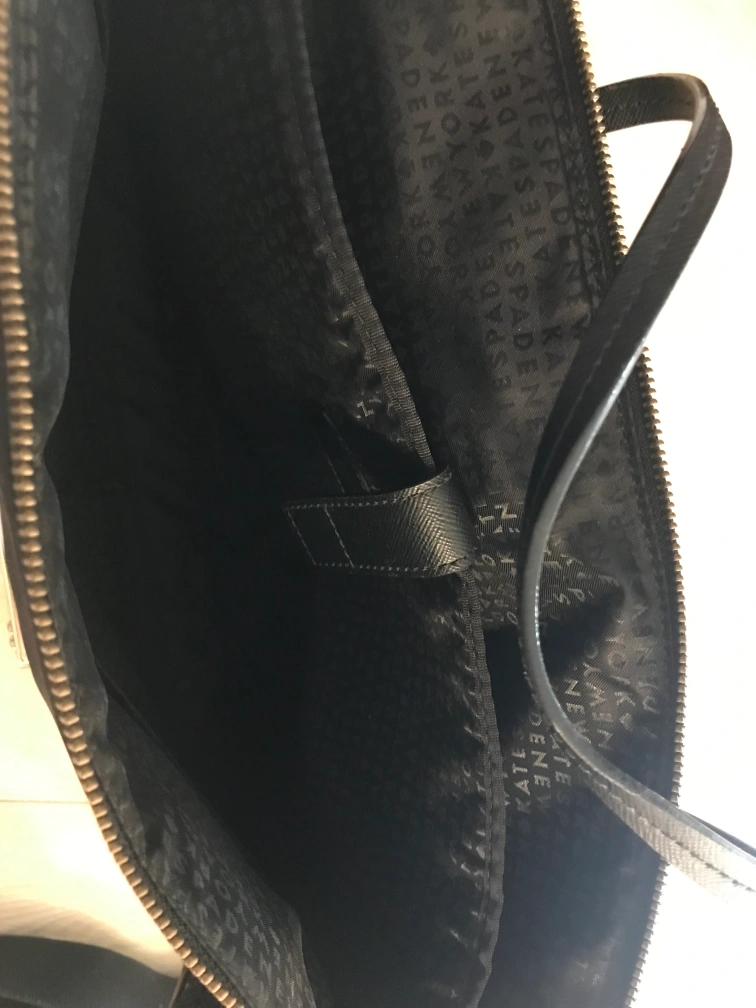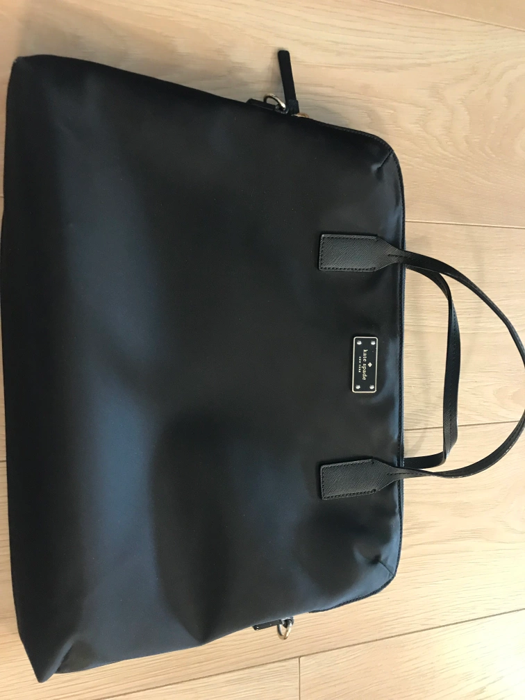 This is a brand new, never-used Kate Spade laptop bag. It's made of an easy-to-clean nylon fabric that has a nice subtle sheen. This makes for a great blend of style and durability. It comes with a detachable crossbody strap.